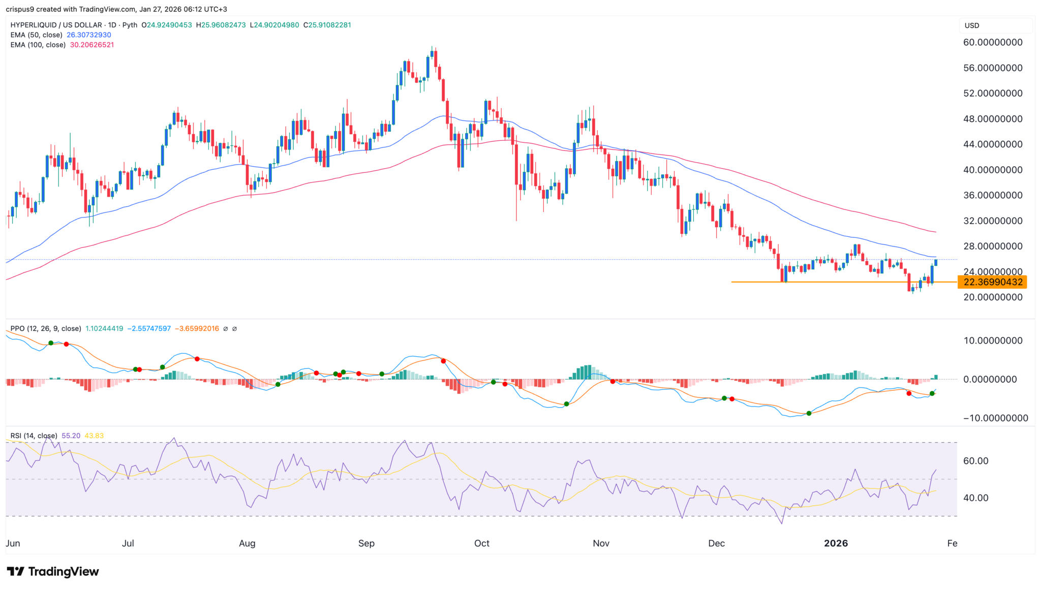 Der HYPE-Kurs ist zwei Tage hintereinander gestiegen und hat den höchsten Stand seit dem 18. Januar erreicht, weil sich der Kryptomarkt erholt hat und Hyperliquid seinen Marktanteil zurückgewonnen hat. Der Hyperliquid-Token wurde bei 25,8 $ gehandelt, was einen deutlichen Anstieg gegenüber dem Jahrestief von 21,27 $ bedeutet.