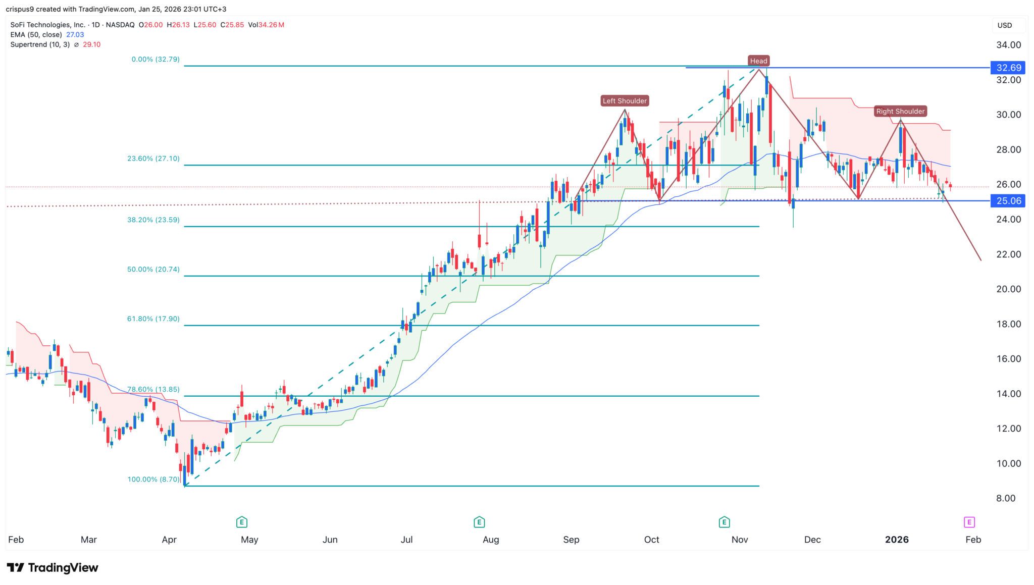 Der Tages-Chart zeigt, dass die SoFi Technology-Aktie riskante Chartmuster gebildet hat, die auf einen Rückgang hindeuten. Sie hat ein Kopf-Schulter-Muster gebildet, dessen Kopf bei 32,70 $ und dessen Schultern bei 30 $ liegen. Besonders auffällig ist, dass die Nackenlinie bei der psychologischen Marke von 25 $ liegt, dem niedrigsten Stand im Oktober und Dezember letzten Jahres.
