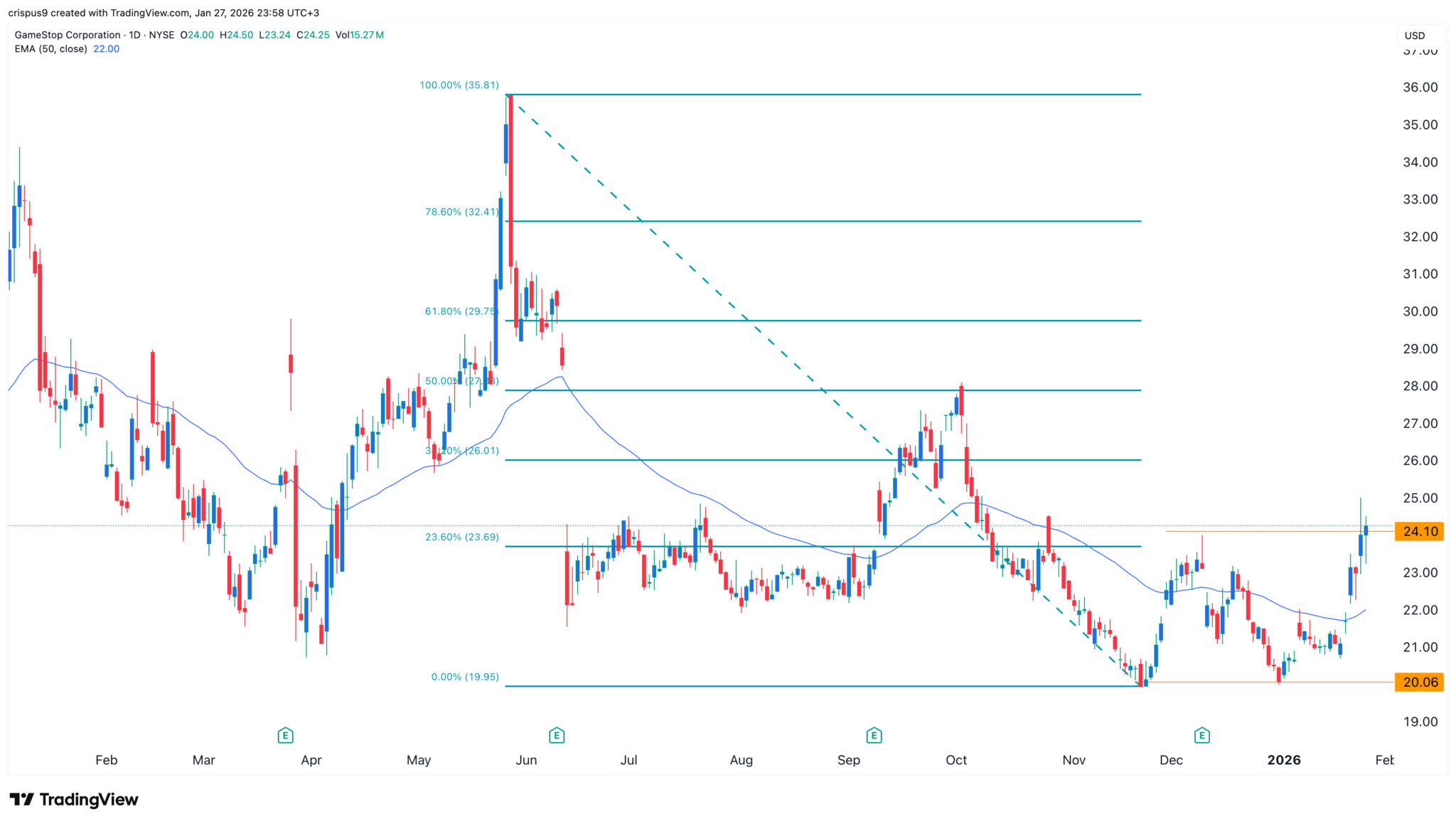 Der GME-Aktienkurs blieb diese Woche stabil und stieg auf den höchsten Stand seit Oktober 2025. GameStop sprang auf einen Höchststand von 24,95 US-Dollar, was einem Anstieg von 25 % gegenüber dem Tiefststand dieses Monats entspricht, da die Investoren wichtige Ereignisse bejubelten.