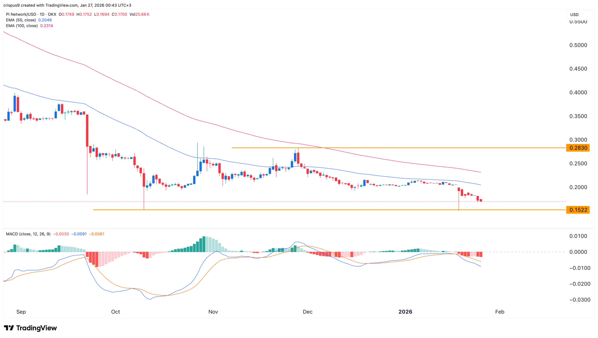 Der Tages-Chart zeigt, dass der Wert von Pi Coin in den letzten Wochen einen starken Abwärtstrend verzeichnet hat. Er ist von einem Höchststand von 0,2830 USD am 28. November auf derzeit 0,1700 USD gefallen.
