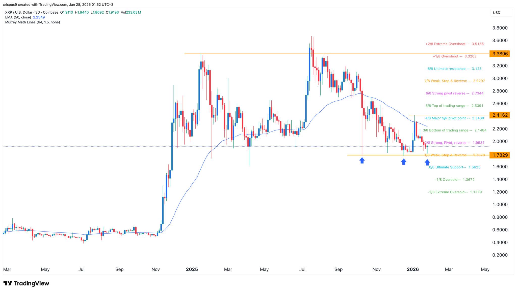 Der Ripple-Token ist unter dem starken, pivotalen und umgekehrten Punkt des Murrey-Math-Lines-Tools bei 1,9530 $ geblieben. Er ist auch unter den wichtigen S&R-Pivot-Punkt bei 2,3438 $ gefallen.