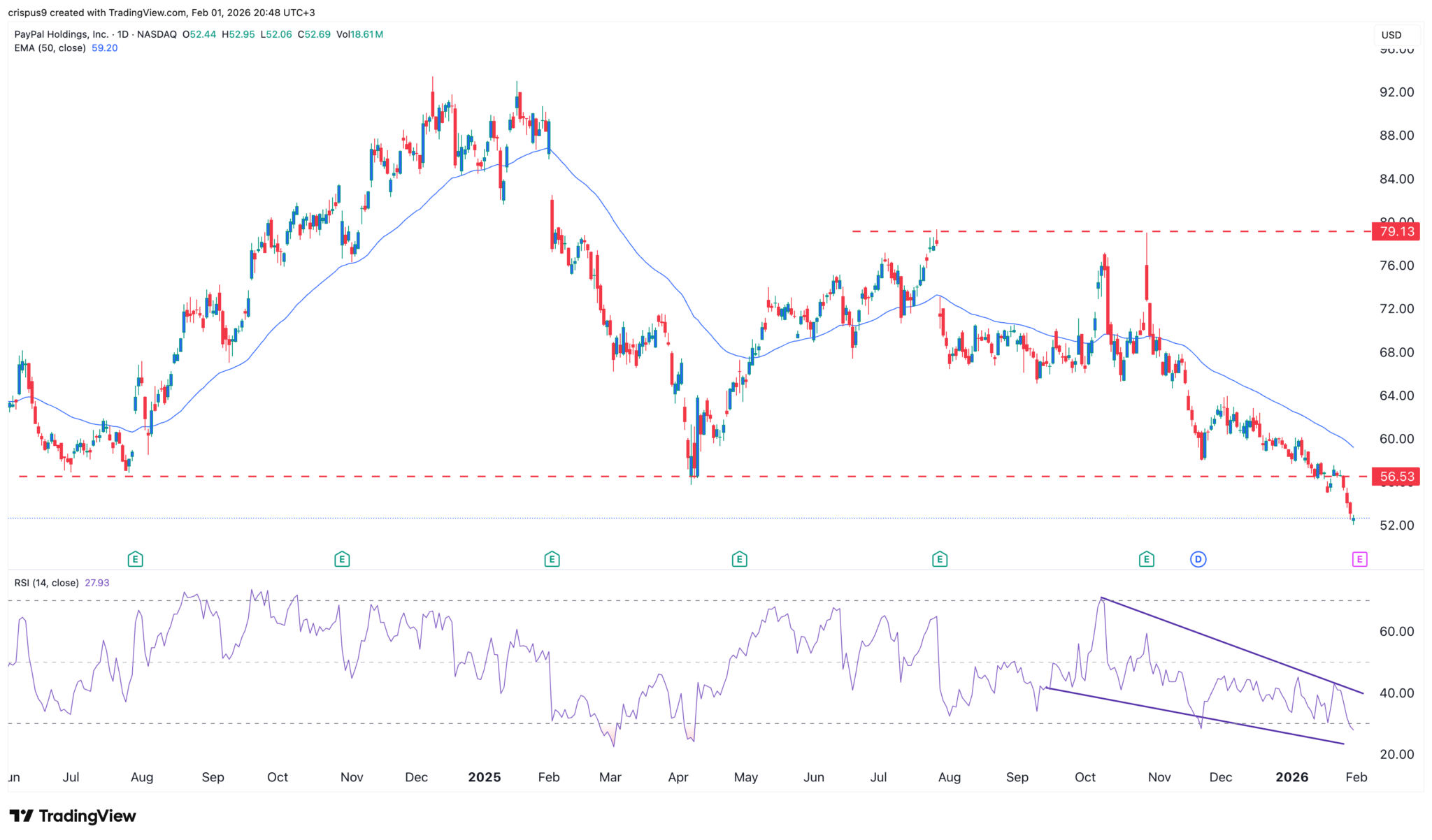 PYPL-Aktienchart | Quelle: TradingViewDer Tageschart zeigt, dass der PYPL-Aktienkurs in den letzten Monaten einen starken Abwärtstrend verzeichnet hat. Er ist jetzt unter die wichtige Unterstützungsmarke von 56,5 $ gefallen, seinem niedrigsten Stand im Juni und Juli 2024 sowie im April letzten Jahres.