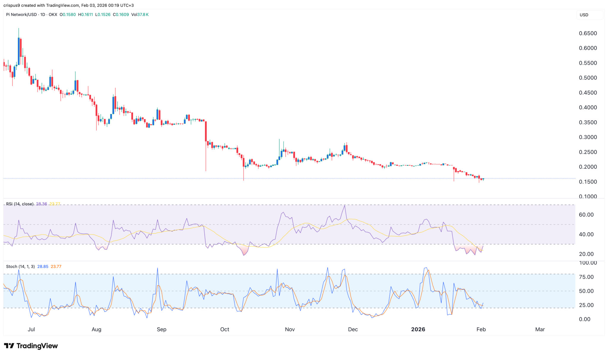 Zweitens deutet die technische Analyse darauf hin, dass der Token stark überverkauft ist, da der Relative Strength Index (RSI) auf das überverkaufte Niveau von 27 gefallen ist. Auch die beiden Linien des Stochastic Oscillators haben sich in die überverkaufte Zone bewegt.