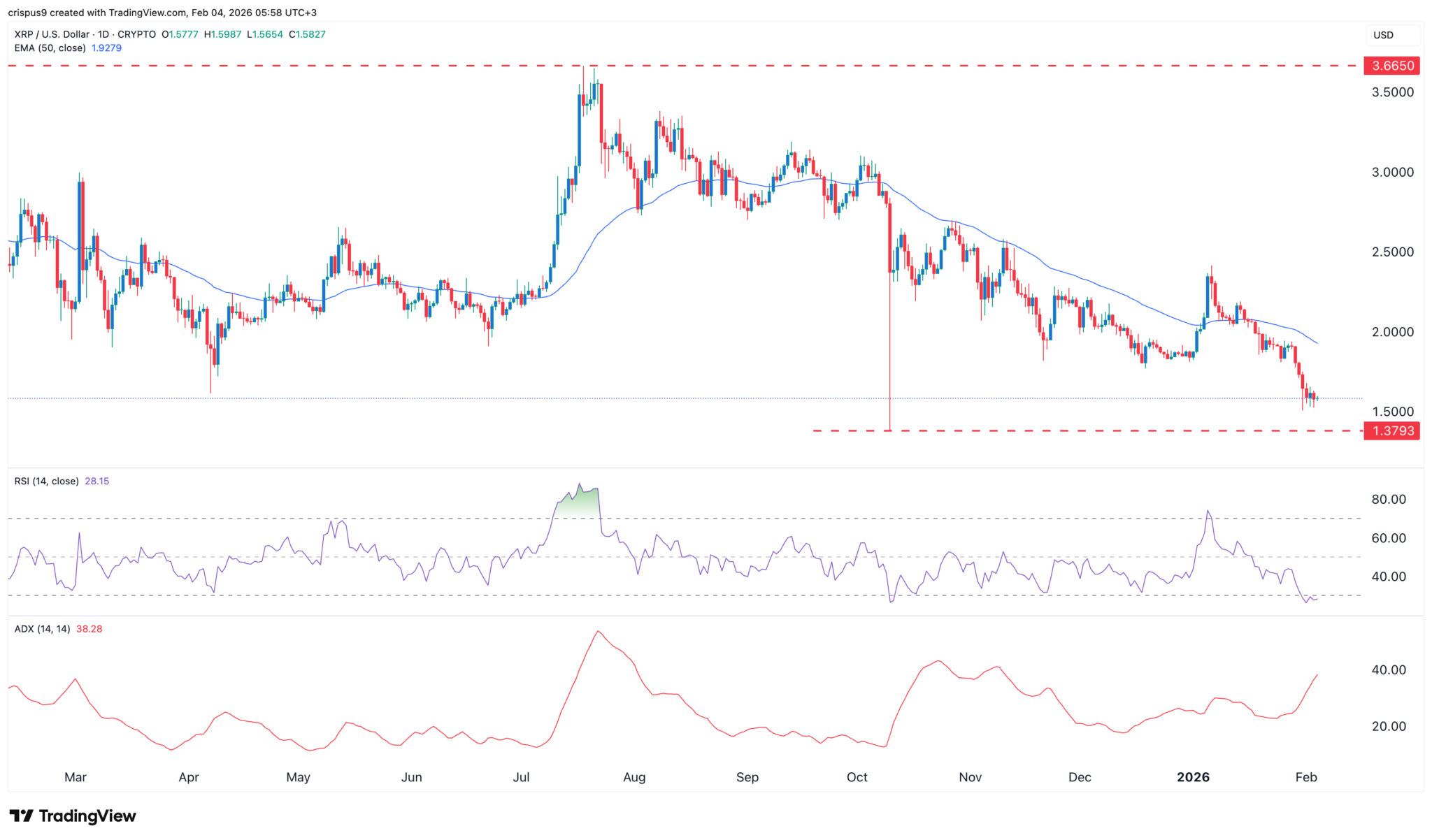 XRP-Kursdiagramm | Quelle: TradingViewDer Tageschart zeigt, dass der XRP-Kurs diese Woche seinen Abwärtstrend fortgesetzt hat. Er bleibt unter dem Supertrend-Indikator und dem 50-Tage-Exponential Moving Average (EMA).