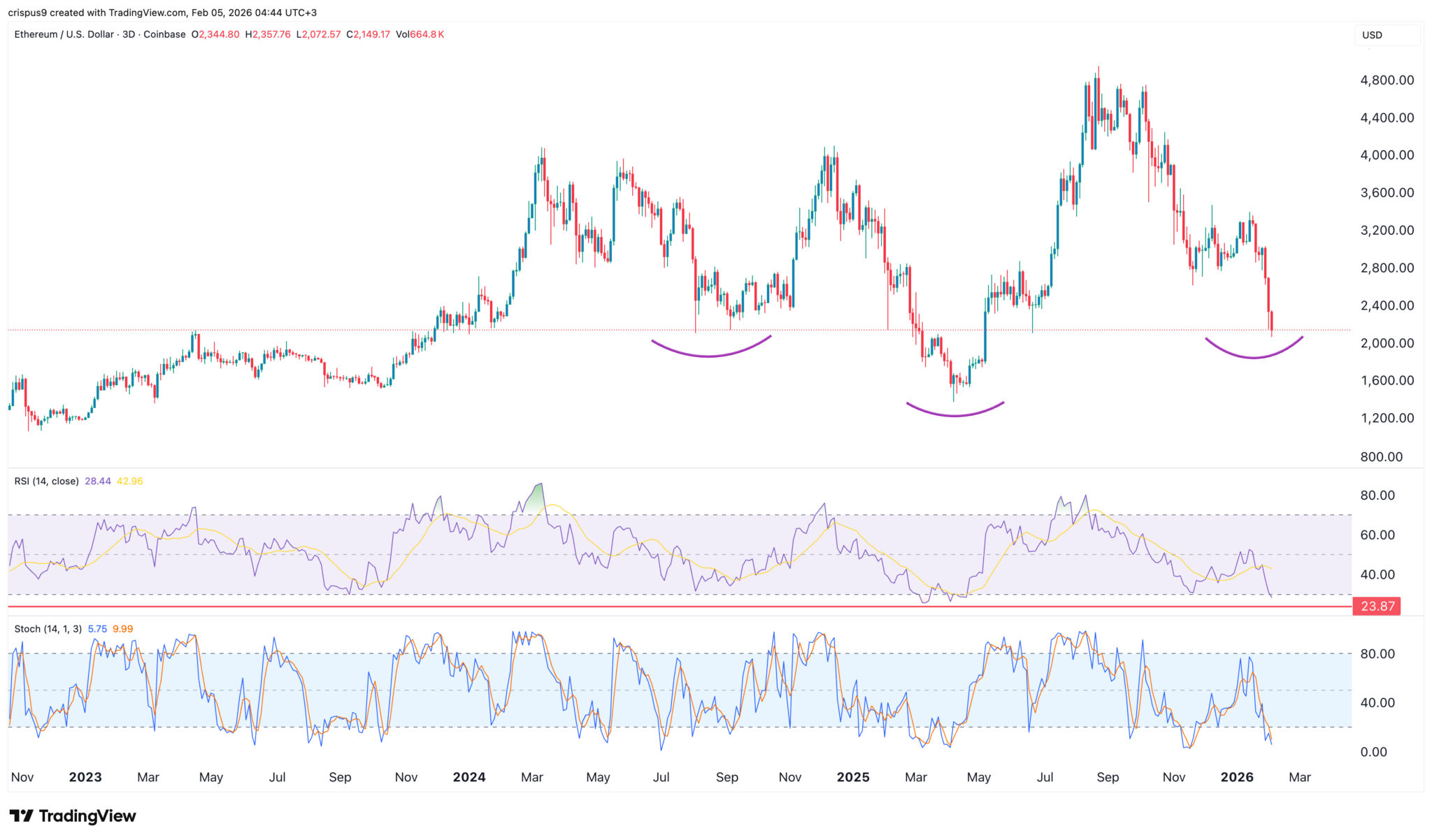 ETH-Tageschart | Quelle: TradingViewDie überverkauften Bedingungen zeigen sich auch auf dem Dreitages-Chart. Gleichzeitig zeigt dieser Chart, dass die Coin ein umgekehrtes Kopf-Schulter-Muster gebildet hat. Der aktuelle Kurs entspricht dem Niveau, auf dem sich im August letzten Jahres die linke Schulter gebildet hat.