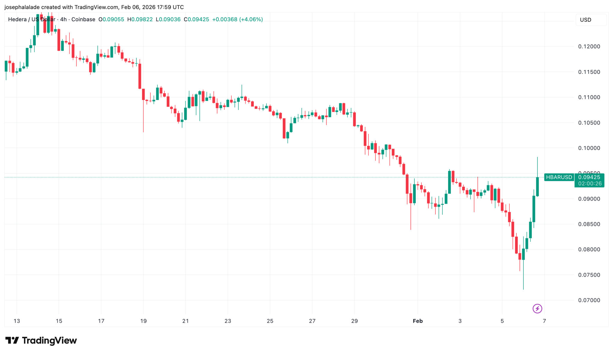 Der Kurs von Hedera ist derzeit für Käufer kurzfristig günstig. Nach einem Rückgang auf etwa 0,073 $ stieg HBAR schnell wieder an, erreichte 0,095 $ und näherte sich dem Tageshoch von etwa 0,0974 $. Der Anstieg wurde durch ein höheres Handelsvolumen unterstützt, was ein starkes Marktinteresse zeigt.