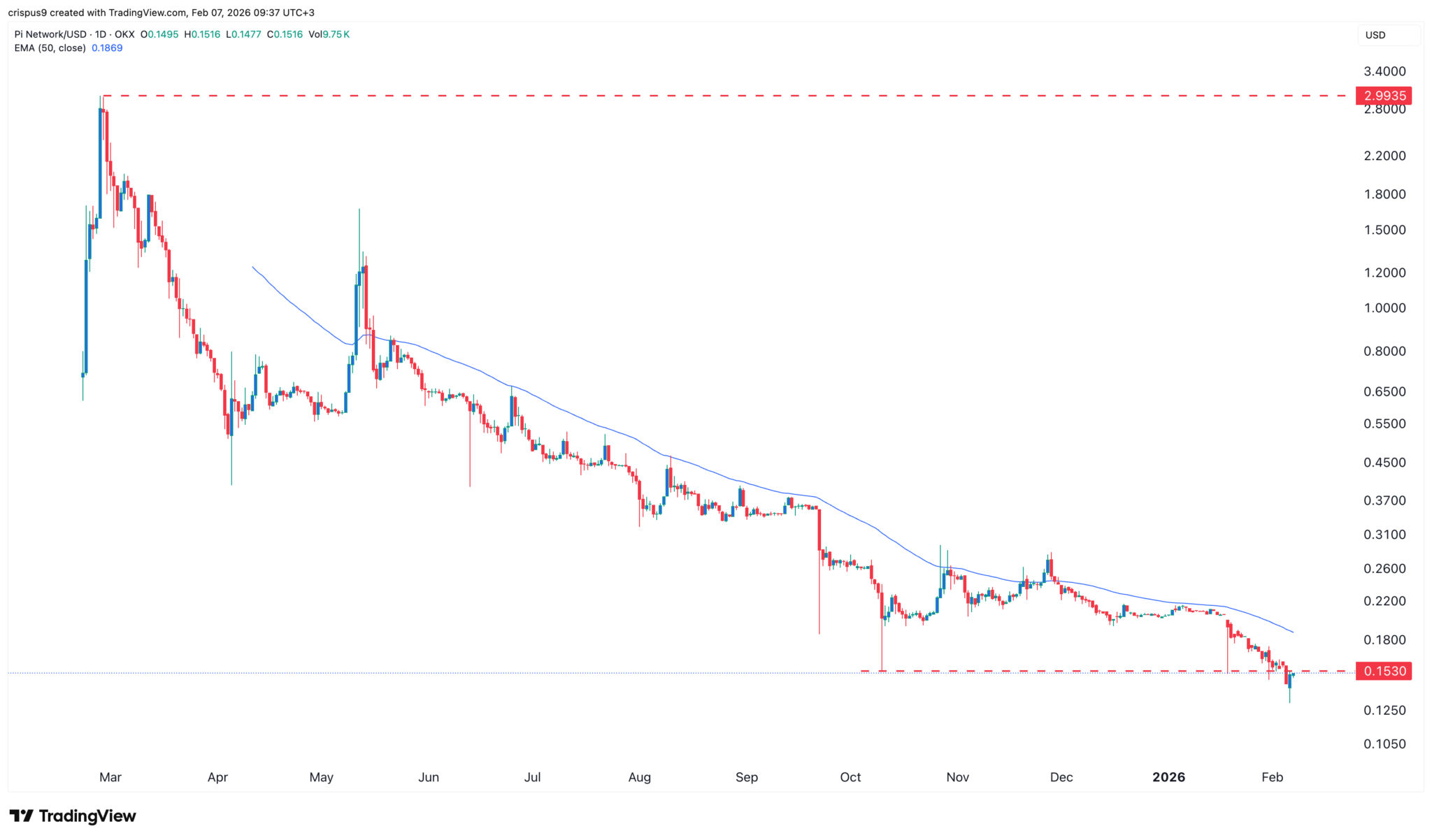 Der Tages-Chart zeigt, dass der Kurs von Pi Network in den letzten Monaten eingebrochen ist und von einem Rekordhoch von 3 $ im Februar letzten Jahres auf ein Rekordtief von 0,1300 $ in dieser Woche gefallen ist.