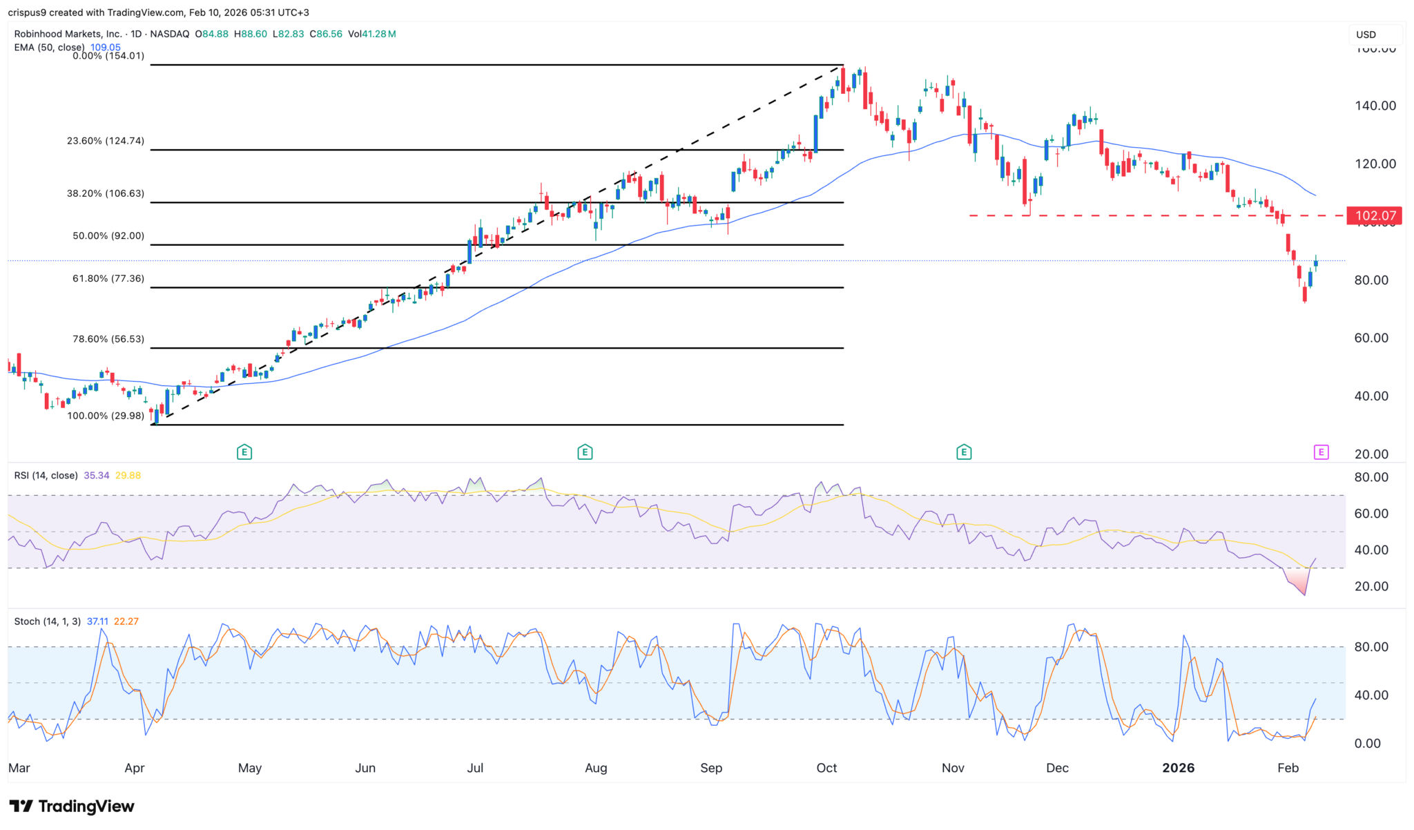 HOOD-Aktienkurschart | Quelle: TradingView Der Tageschart zeigt, dass der HOOD-Aktienkurs in den letzten Monaten eingebrochen ist und eines der Unternehmen mit der besten Performance im S&P 500 Index im Jahr 2025 zu einem der größten Nachzügler gemacht hat. Er ist von einem Höchststand von 155 $ auf derzeit 86 $ gefallen.