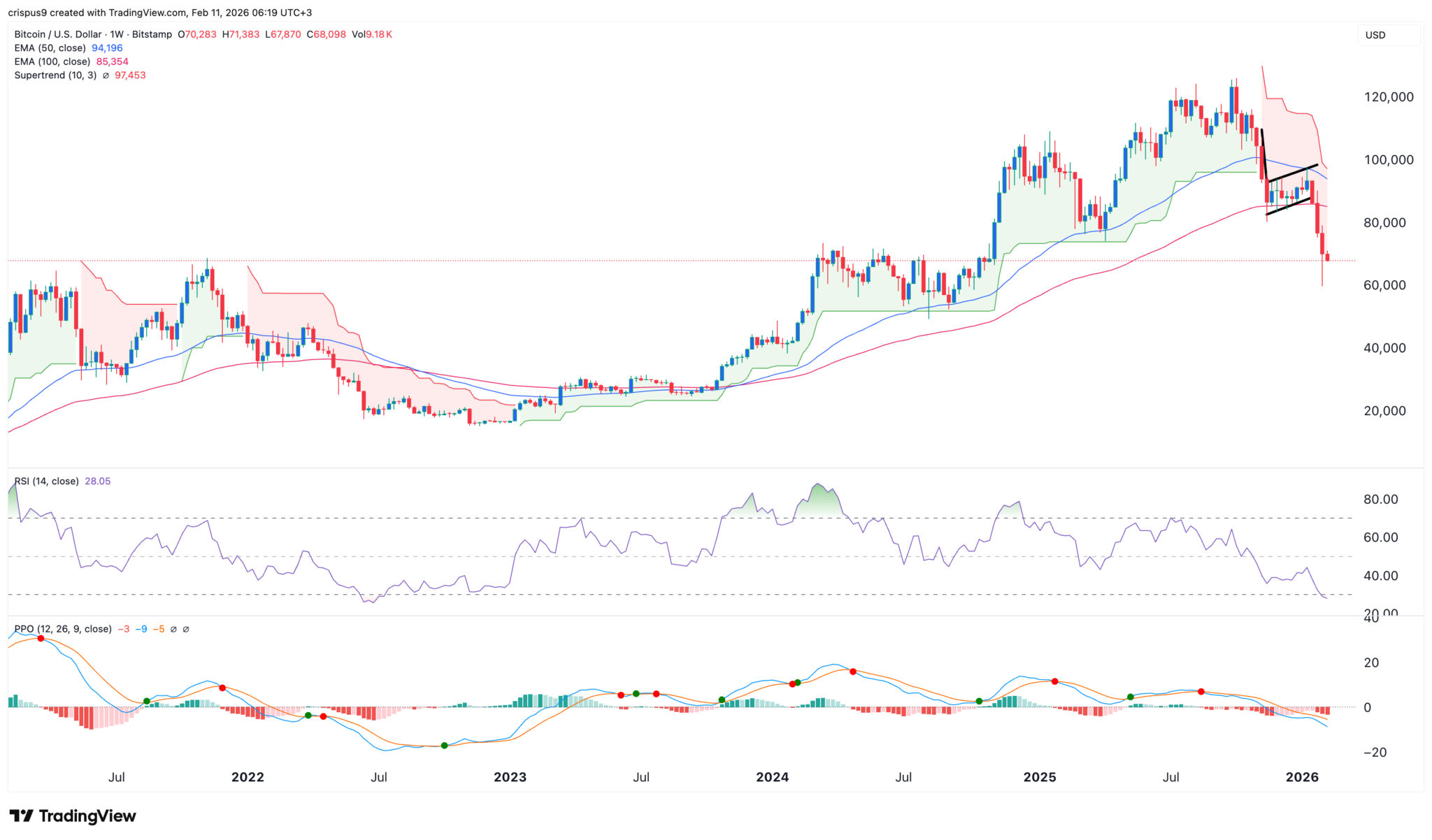Der Wochenchart zeigt, dass der Wert von Bitcoin in den letzten Wochen weiter gefallen ist. Er ist von einem Rekordhoch von 126.300 Dollar im Oktober auf aktuell 68.650 Dollar zurückgegangen.