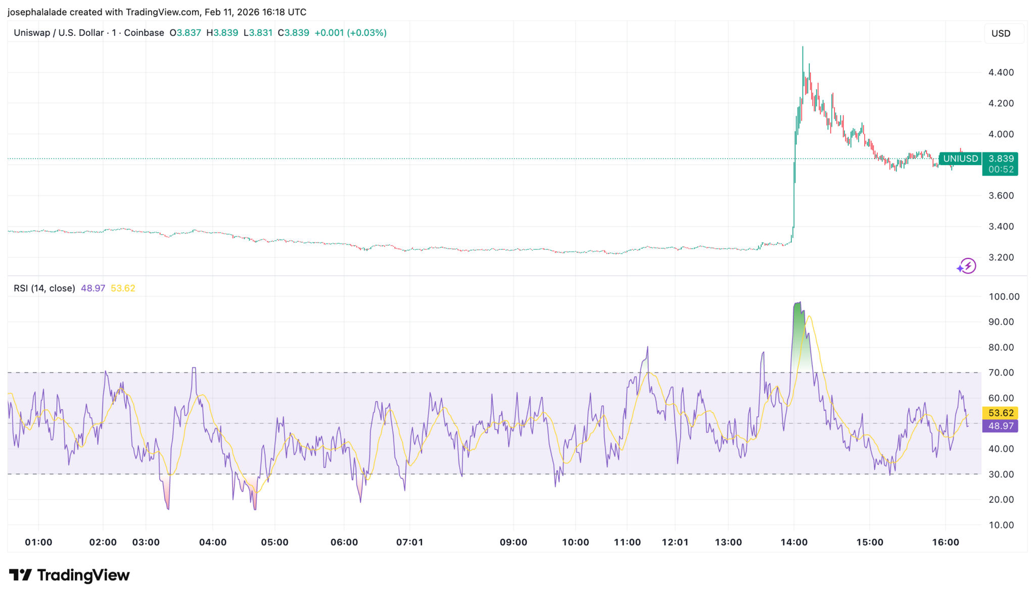 Auf dem Intraday-Chart stieg der Uniswap-Kurs stark von etwa 3,23 $ an und erreichte den Bereich von 4,40 $, bevor er wieder auf 3,80 $ zurückfiel. Die Bewegung war abrupt und von Schlagzeilen getrieben, wobei das Volumen parallel zum Kurs anstieg, anstatt sich durch eine allmähliche technische Konstellation aufzubauen.