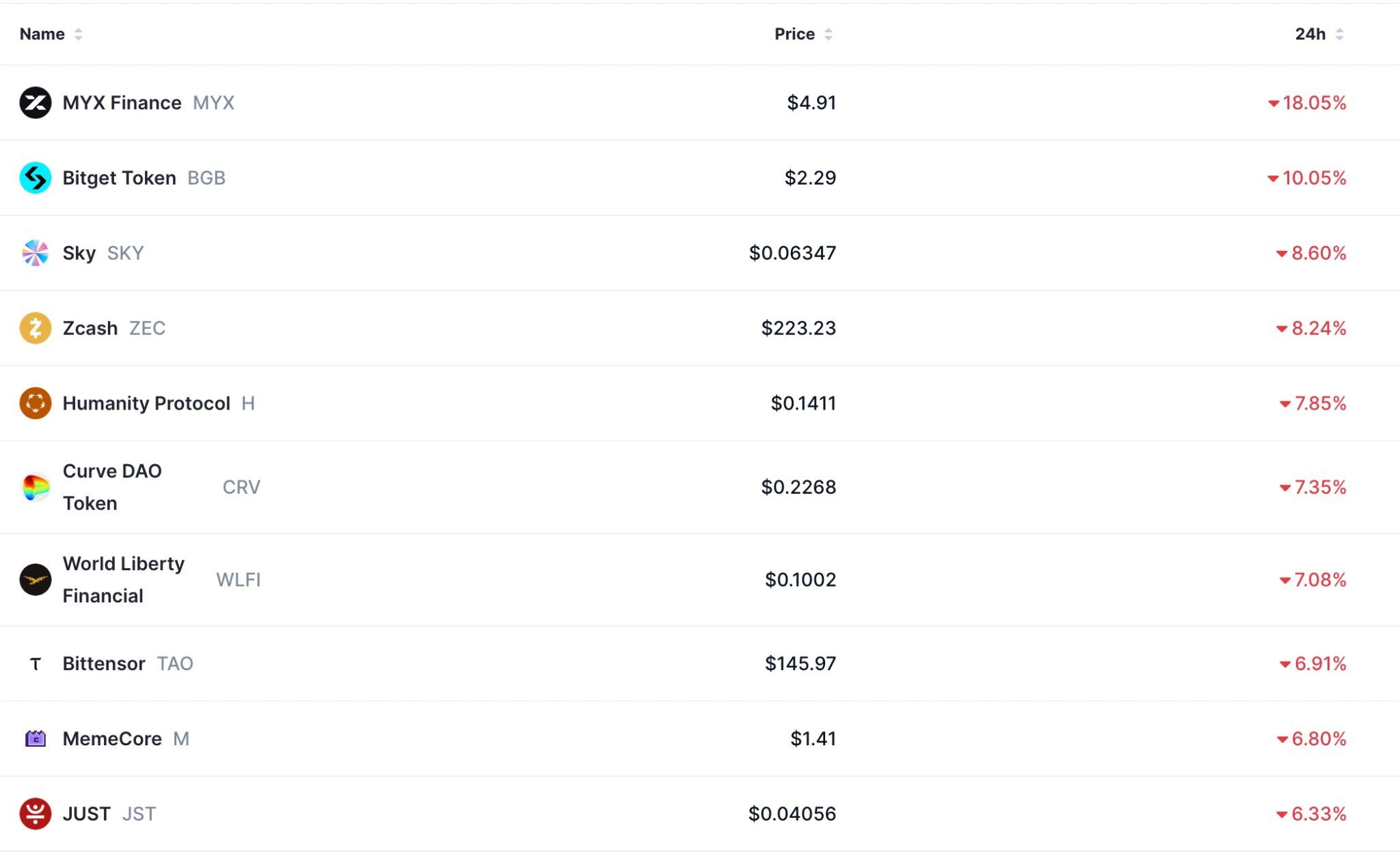 Die Marktkapitalisierung aller Token sank um über 3 % auf 2,27 Billionen US-Dollar, während der Crypto Fear and Greed Index auf 9 einbrach. Zu den größten Verlierern auf dem Kryptomarkt gehörten Altcoins wie MYX Finance, Bitget Token, Sky, Zcash und Humanity Protocol.