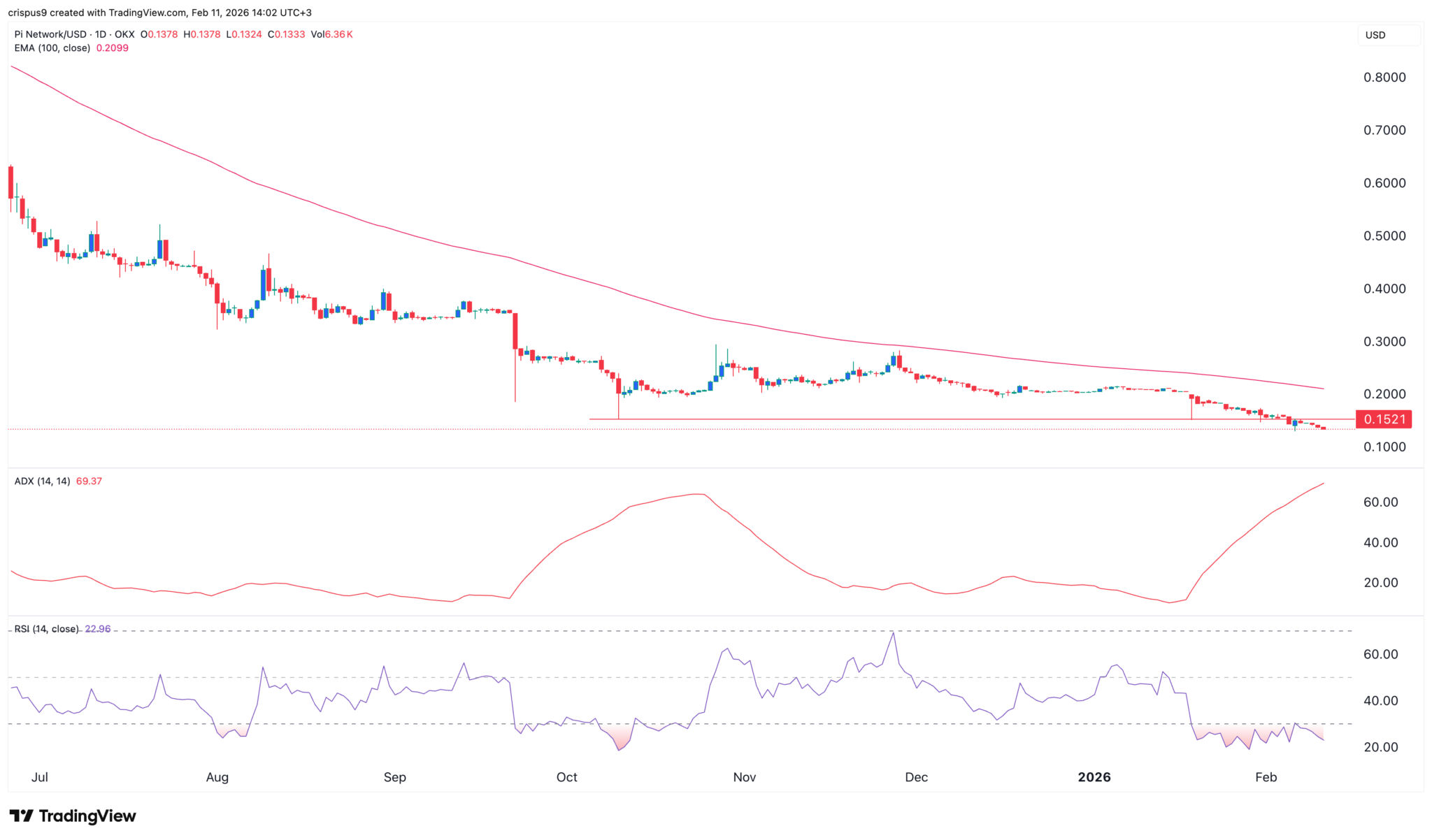 PI Network-Kursdiagramm | Quelle: TradingViewDer Tages-Chart zeigt, dass der Pi Coin-Kurs in den letzten 12 Monaten einen starken Abwärtstrend verzeichnet hat und jetzt auf seinem Allzeittief gehandelt wird. Er ist unter wichtige Unterstützungsniveaus gefallen, darunter 0,1520 $, sein niedrigster Stand im Oktober letzten Jahres.