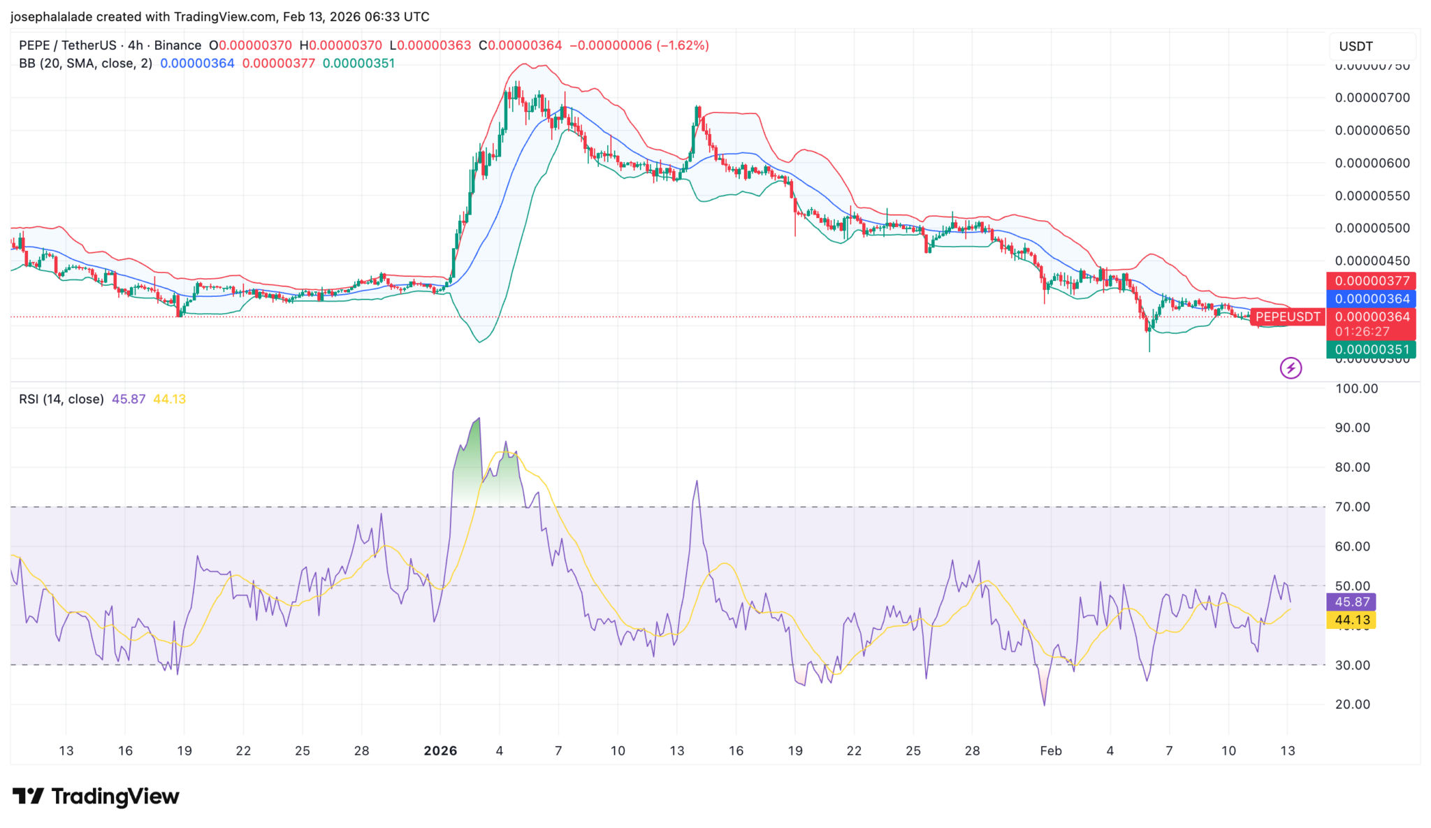 Auf dem 4-Stunden-Chart handelt der PEPE-Kurs weiterhin unterhalb seines mittleren Bollinger-Bandes, wobei sich die Bänder nach der Volatilitätsausweitung Anfang Januar verengen. Der Kurs hält sich in der unteren Hälfte der Bandstruktur, was eher auf eine Kompression als auf eine Richtungstendenz hindeutet.