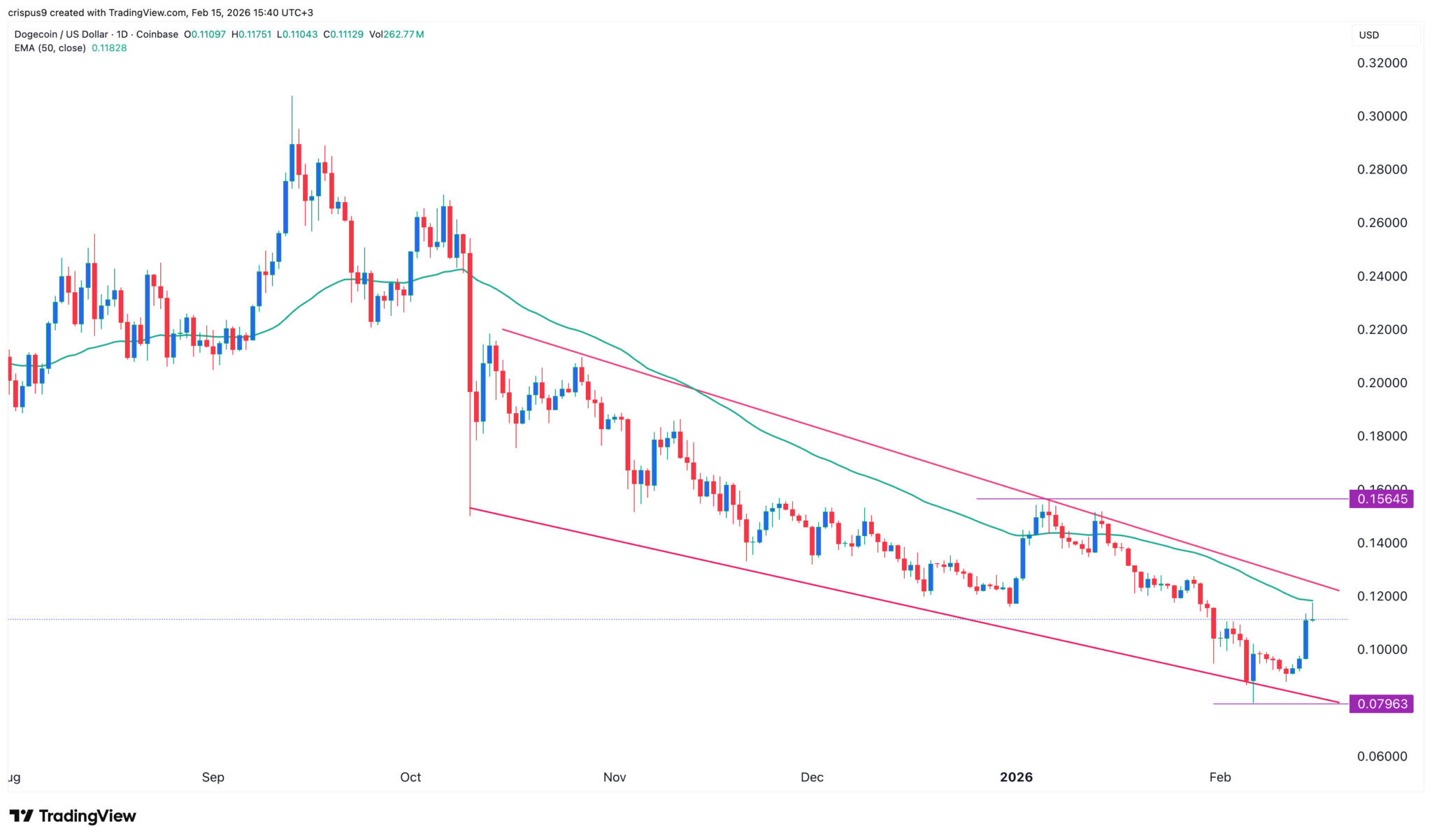 Die anhaltende Erholung von Dogecoin hat sich beschleunigt, nachdem die USA den neuesten Verbraucher-Inflationsbericht veröffentlicht haben, der zeigt, dass der Verbraucherpreisindex (CPI) von 2,6 % im Dezember auf 2,4 % im Januar dieses Jahres zurückgegangen ist. Kryptowährungen und andere risikoreiche Anlagen entwickeln sich gut, wenn die Inflation sinkt, da dies normalerweise zu weiteren Zinssenkungen führt.