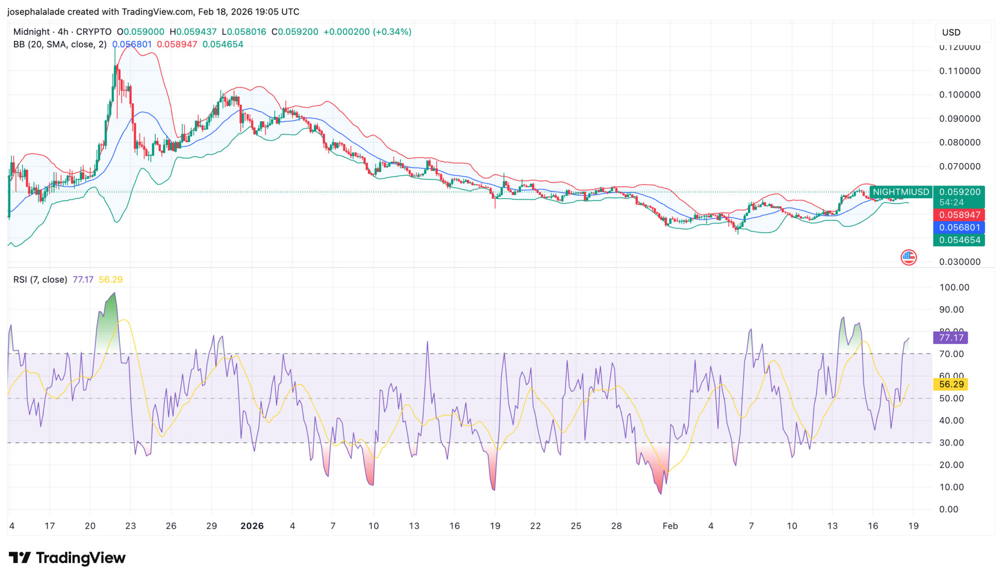 Laut dem Vier-Stunden-Chart von TradingView wird Midnight (NIGHT) nahe der oberen Hälfte seiner Bollinger-Bänder gehandelt, wobei das mittlere Band bei 0,0568 $ und das obere Band bei 0,0589 $ liegt. Diese Platzierung spiegelt das anhaltende Interesse der Käuferseite wider, zeigt aber auch, dass der Aufwärtstrend überlaufen ist.