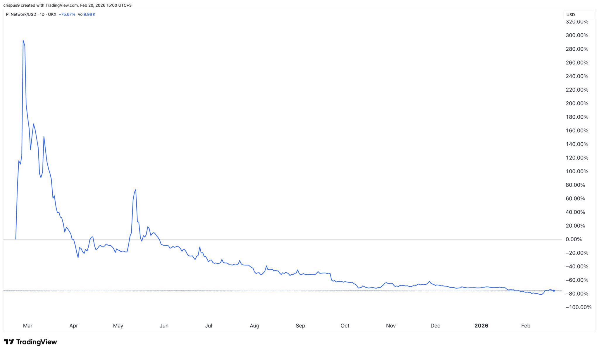 Der Kurs der Pi Network Coin ist ein Jahr nach dem mit Spannung erwarteten Start des Mainnets zu einem gefallenen Engel geworden. Der Token wurde am Freitag bei 0,1740 $ gehandelt, was weit unter dem Allzeithoch von 3 $ liegt. Die Marktkapitalisierung ist von ihrem Allzeithoch von fast 20 Milliarden $ auf heute 1,3 Milliarden $ gefallen.