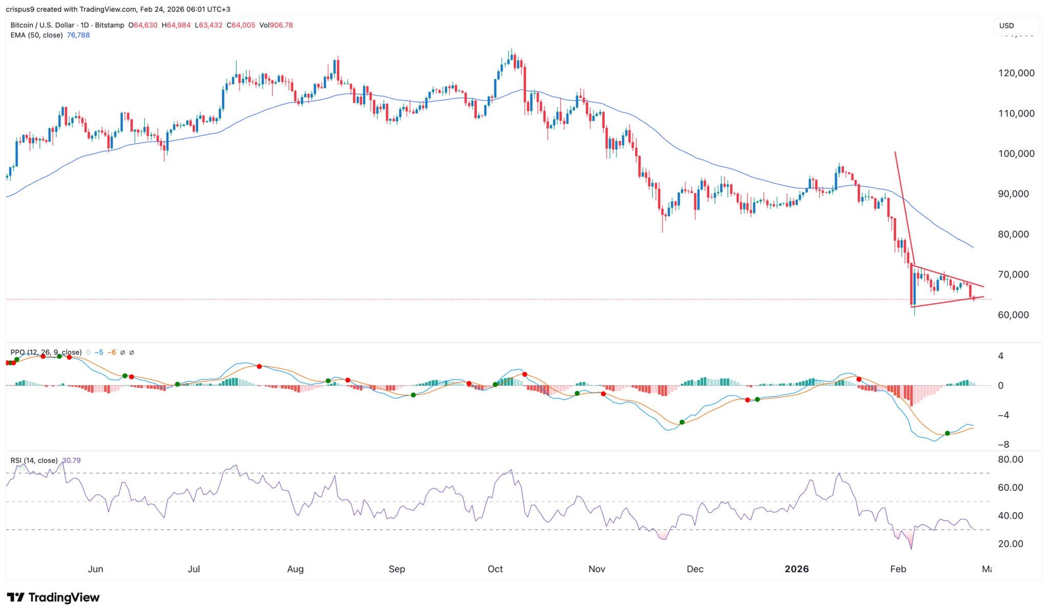 Die technische Analyse deutet darauf hin, dass der Bitcoin-Kurs in diesem Monat weiter fallen wird. Er ist unter allen gleitenden Durchschnitten und dem Supertrend-Indikator geblieben. Das ist ein Zeichen dafür, dass die Bären heute die Kontrolle haben.