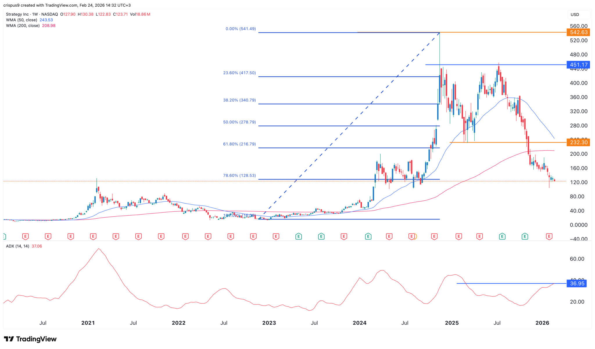 Der Wochenchart zeigt, dass die Strategy-Aktie in den letzten Monaten eingebrochen ist. Dieser Rückgang begann, nachdem sie ein Double-Top-Muster bei 450 USD und eine Nackenlinie bei 232 USD, ihrem niedrigsten Stand im Februar letzten Jahres, gebildet hatte.