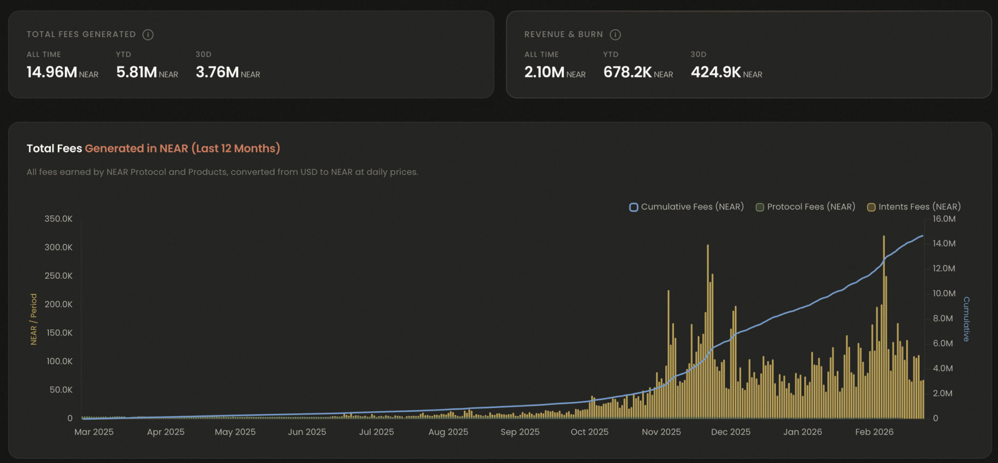 Quelle: NEAR-Einnahmen Intents hat ein Cross-Chain-Volumen von über 13 Milliarden US-Dollar abgewickelt und verarbeitet derzeit monatlich Handelsaktivitäten im Wert von rund 3 Milliarden US-Dollar. Dieser Fluss ist wichtig, weil mehr Volumen mehr Gebühren bedeutet und mehr Gebühren mehr Rückkäufe bedeuten. Das erklärte Ziel ist eine Schwelle, bei der die aus dem Umlauf genommenen Token die Neuemissionen übersteigen, wodurch ein deflationäres Flywheel entsteht.
