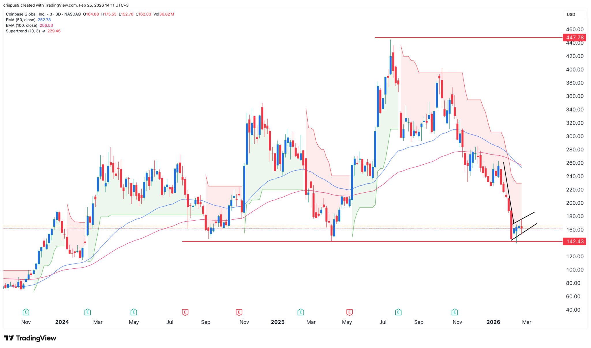 Eine solche Bewegung würde die Wahrscheinlichkeit erhöhen, dass die COIN-Aktie auf das wichtige Unterstützungsniveau von 100 USD fällt, was etwa 40 % unter dem aktuellen Niveau liegt.