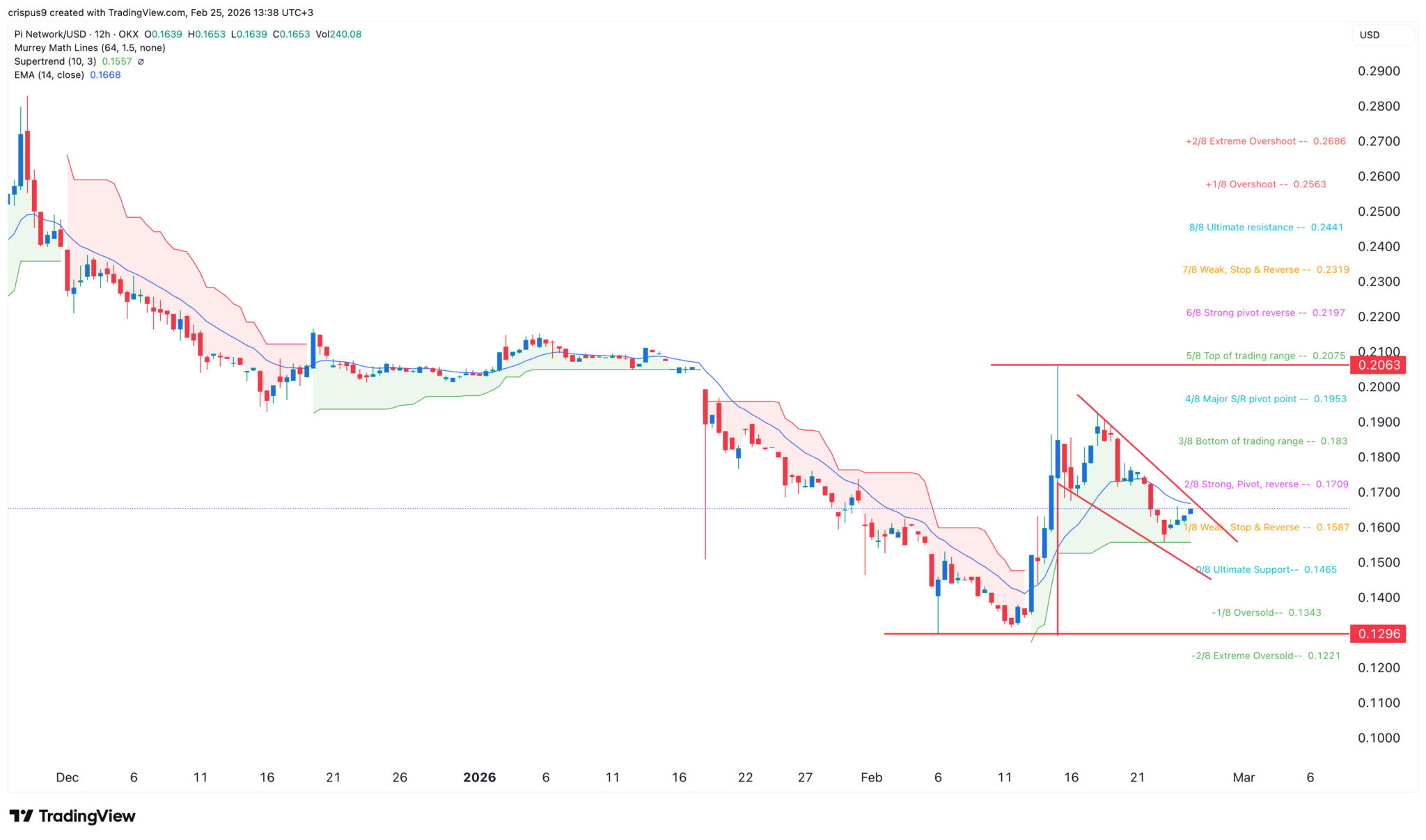 Der 12-Stunden-Chart zeigt, dass der Pi Coin-Kurs in den letzten Wochen echt volatil war. Er ist von einem Höchststand von 0,2063 $ Anfang dieses Monats auf aktuell 0,1653 $ gefallen. Dieser Rückgang passierte, als Investoren Gewinne mitnahmen, nachdem der Kurs von seinem Tiefststand in diesem Monat um über 60 % gestiegen war.