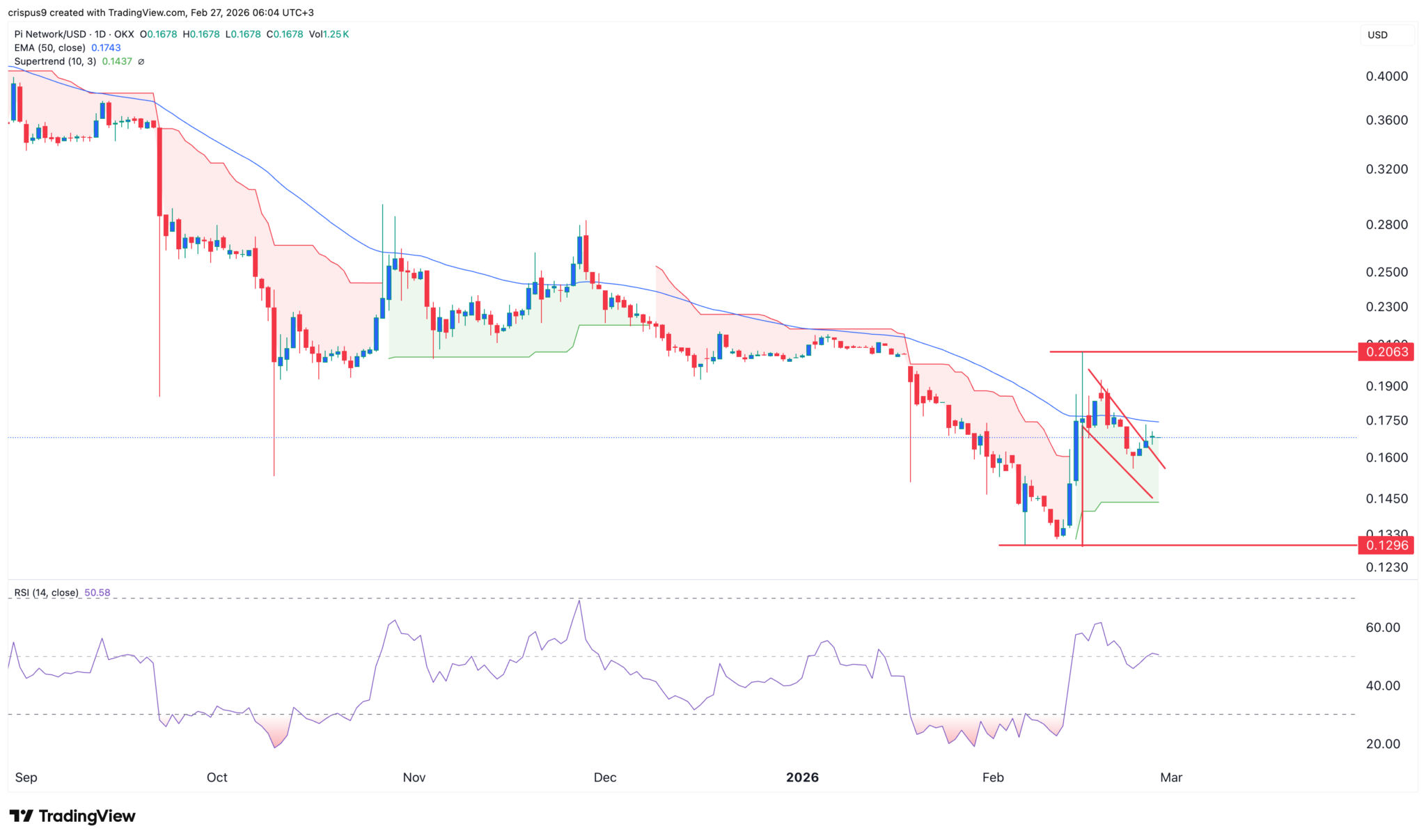 Das Tageschart zeigt, dass sich der Pi-Token in den letzten Wochen gut entwickelt hat. Er ist über den Supertrend-Indikator gestiegen, was ein Zeichen dafür ist, dass die Bullen die Kontrolle behalten haben. Es ist das erste Mal seit Dezember letzten Jahres, dass der Indikator grün geworden ist.