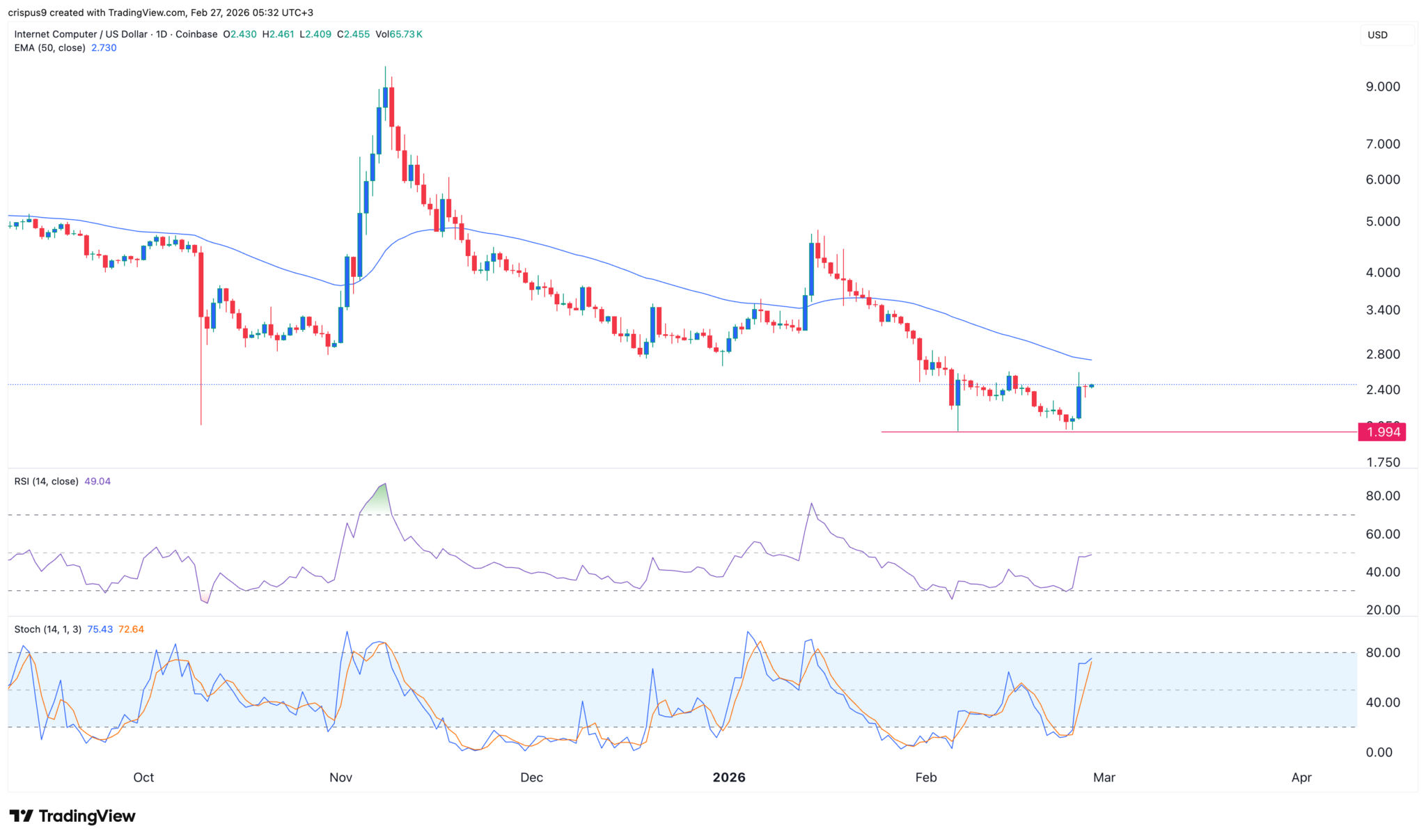 ICP-Kurs-Chart | Quelle: TradingViewDer Tages-Chart zeigt, dass der ICP-Kurs diesen Monat bei 1,99 $ seinen Tiefpunkt erreicht hat und nun wieder auf 2,46 $ gestiegen ist, da es zu einer Erholung des Kryptomarktes gekommen ist. Die Münze hat ein Double-Bottom-Muster gebildet, was im Laufe der Zeit oft zu einem weiteren Aufwärtstrend führt.