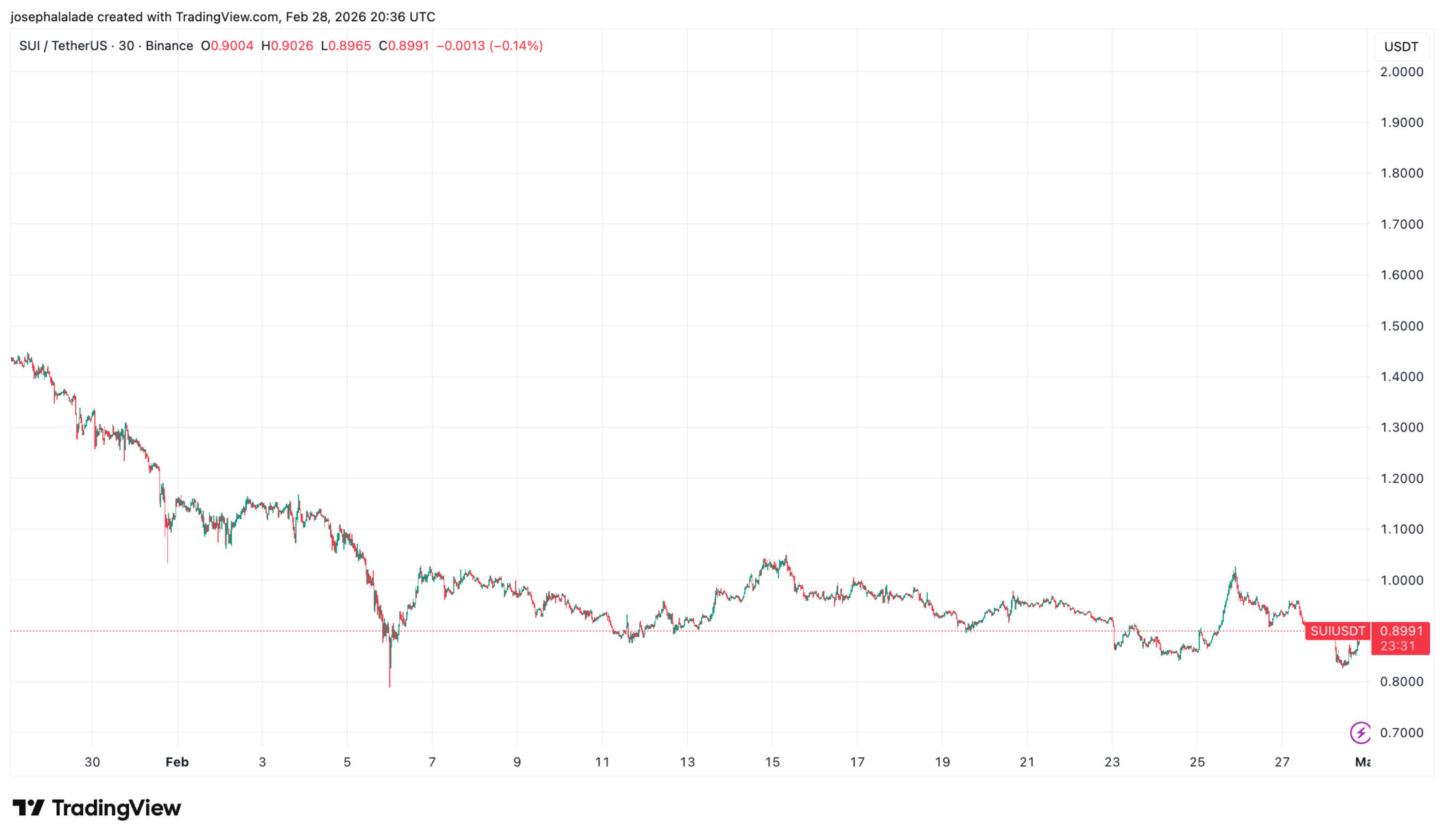 Der SUI-Kurs ist diese Woche um mehr als 12 % gefallen und liegt jetzt bei 0,8864 $, wobei das Volumen um 40,39 % auf 902,43 Millionen $ gestiegen ist, weil die Verkäufer den Kurs während der ganzen Sitzung runtergedrückt haben. Diese Entwicklung kommt trotz eines historischen Monats für den Token: Im Februar wurden in den USA drei Spot-SUI-ETFs aufgelegt, darunter als Höhepunkt der TSUI von 21Shares an der Nasdaq am 24. Februar. Jede Notierung hat jedoch keine anhaltende Nachfrage ausgelöst, sondern wurde durch eine konstante Verteilung absorbiert.
