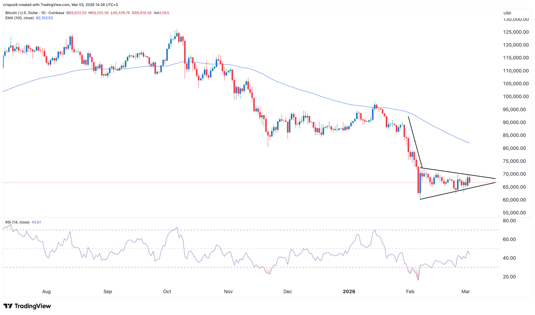 Der Bitcoin-Kurs ist am Dienstag um über 3 % gefallen, weil die Sorgen um den Krieg im Iran zugenommen haben, was zu höheren Rohöl- und Erdgaspreisen geführt hat. BTC ist auf 66.000 $ gefallen, einen Tag nachdem es die wichtige Widerstandsmarke von 70.000 $ erreicht hatte. Es hat auch ein bärisches Wimpelmuster gebildet, was auf weitere Abwärtsbewegungen hindeutet.