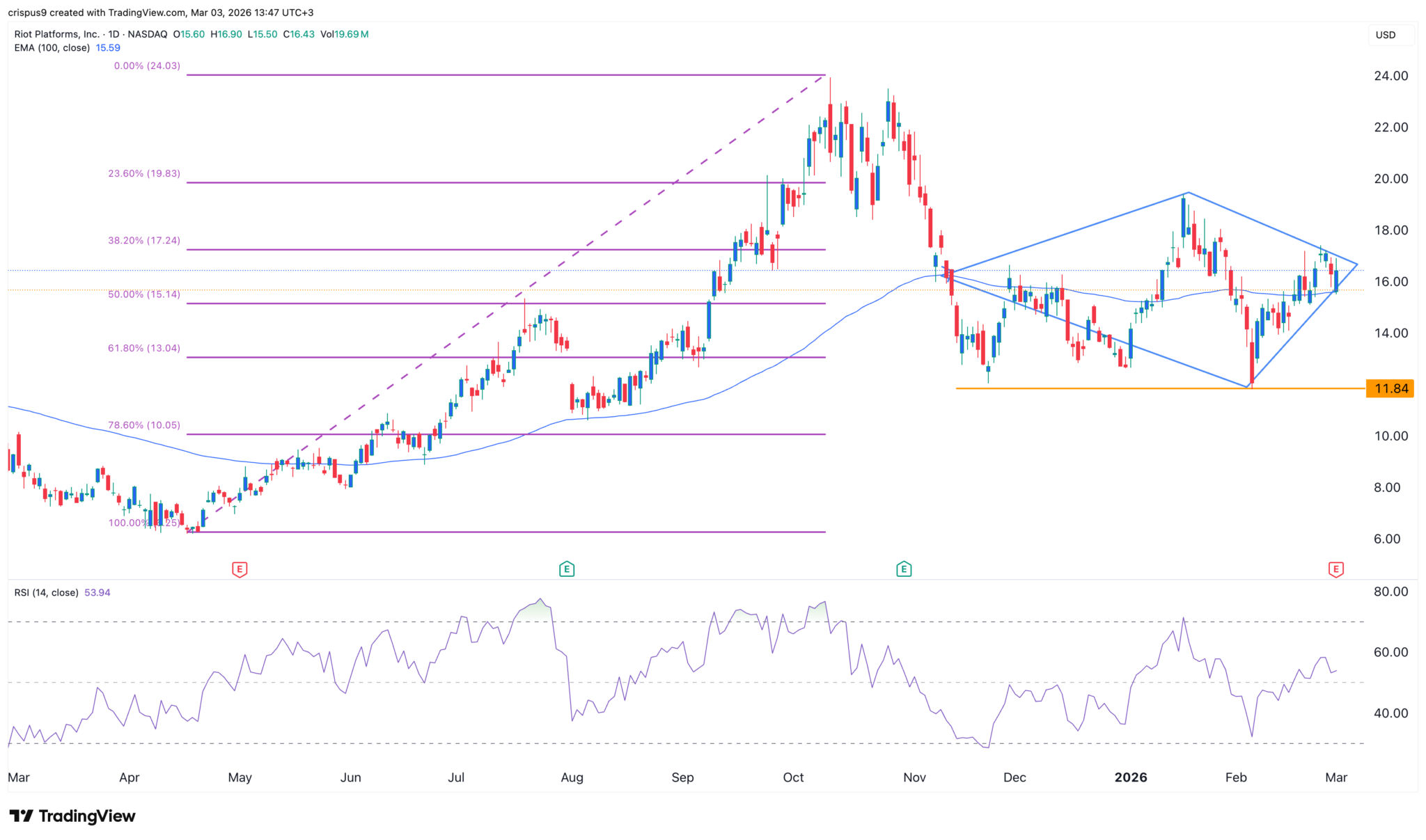Der Tageschart zeigt, dass der Aktienkurs von RIOT nach der Veröffentlichung der Geschäftszahlen stark zurückgegangen ist. Diese Ergebnisse kamen, nachdem die Aktie ein Diamant-Umkehrmuster gebildet hatte, was eine riskante Situation ist. Sie ist auf das 50 %-Fibonacci-Retracement-Niveau zurückgegangen.
