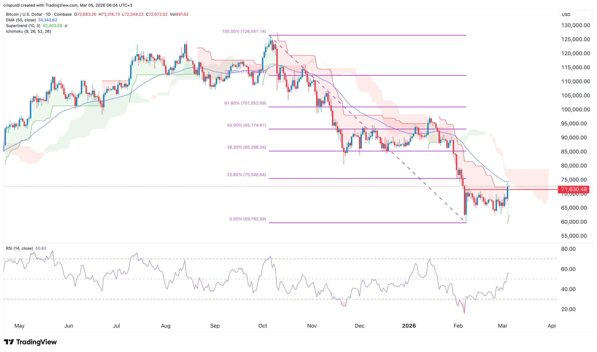 BTC-Kursdiagramm | Quelle: TradingView Technisch gesehen zeigt das obige Diagramm, dass Bitcoin bei dem exponentiellen gleitenden Durchschnitt (EMA) von 50 Tagen auf Widerstand gestoßen ist. Es bleibt auch unter den Indikatoren Supertrend und Ichimoku-Wolke. Damit es zu einem Bullenlauf kommt, muss die Coin über diese Indikatoren steigen, da dies mehr Käufer anziehen würde.