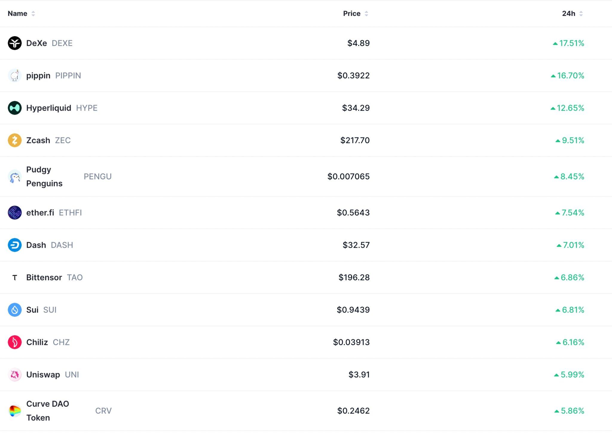 Die meisten Altcoins waren im Plus, wobei DeXe, Pippin, Hyperliquid, Zcash und Pudgy Penguins die größten Gewinner waren. Alle diese Token legten um über 8 % zu.