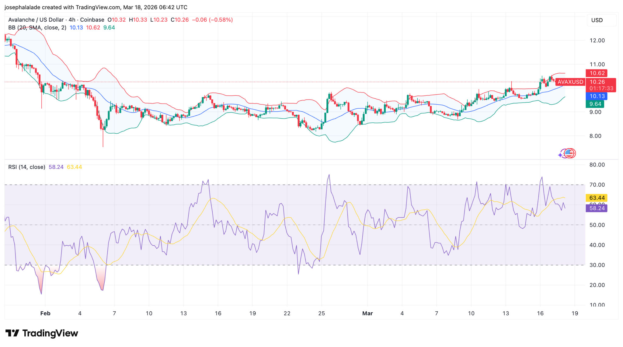 AVAX-Kurschart | TradingViewDie Bollinger-Bänder zeigen, dass sich der Kurs in Richtung des oberen Bandes bei 10,62 $ bewegt, wobei das mittlere Band bei 10,13 $ und das untere bei 9,64 $ liegt. Die Bänder sind relativ eng, eine Konstellation, die sich historisch gesehen eher mit einem Richtungsschub als mit einer anhaltenden Seitwärtsbewegung auflöst. Der RSI auf dem 4-Stunden-Chart liegt bei 58,24, wobei die Signallinie bei 63,44 steht, was darauf hindeutet, dass sich das Momentum gegenüber den jüngsten Höchstständen abgeschwächt hat, sich aber noch nicht umgekehrt hat.