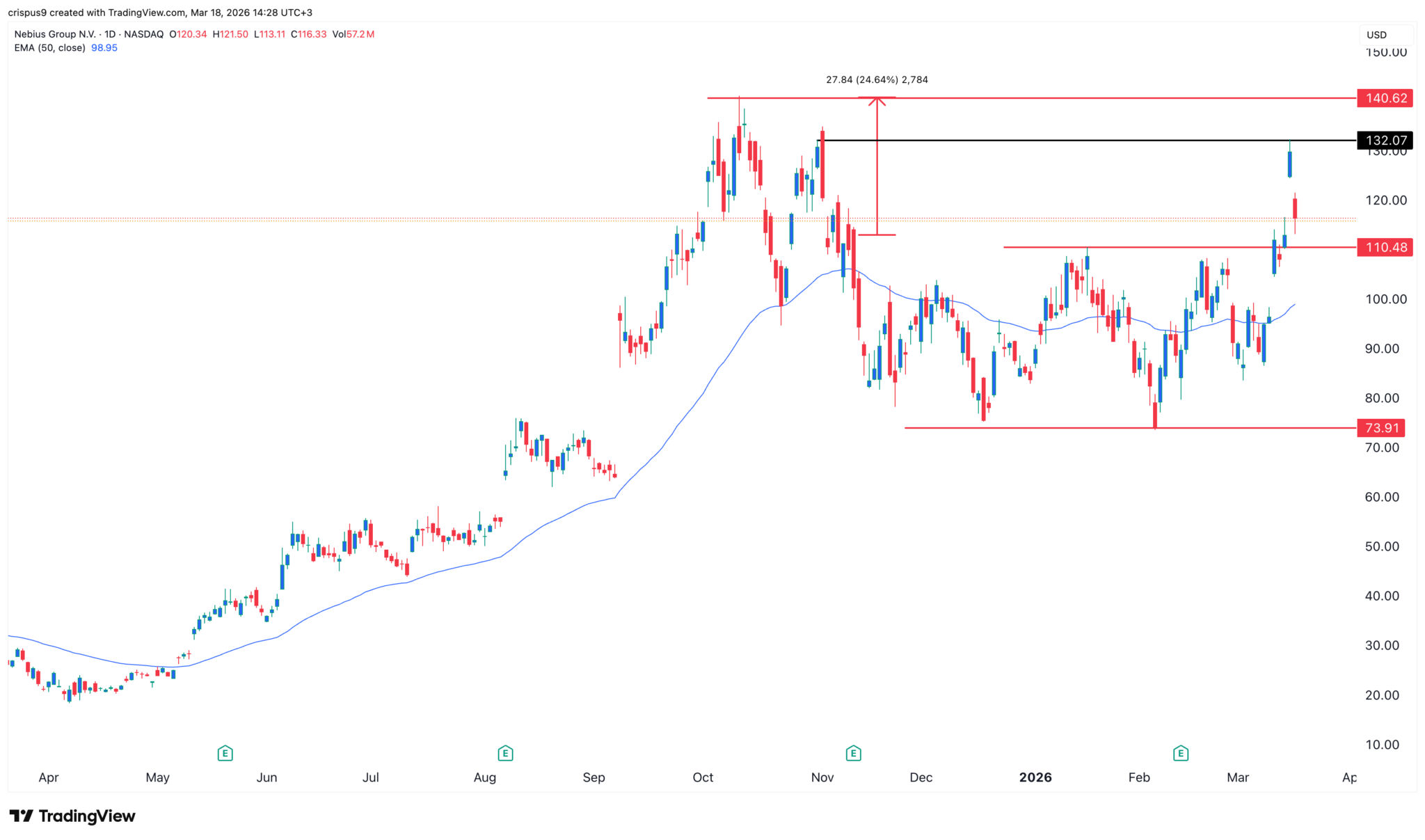 Der NBIS-Aktienkurs sprang von einem Tiefststand von 73,9 $ – seinem niedrigsten Stand am 5. Februar – auf ein Hoch von 132 $ in dieser Woche. Anschließend fiel er auf die aktuellen 116 $ zurück, da Anleger nach dem jüngsten Anstieg Gewinne mitnahmen.