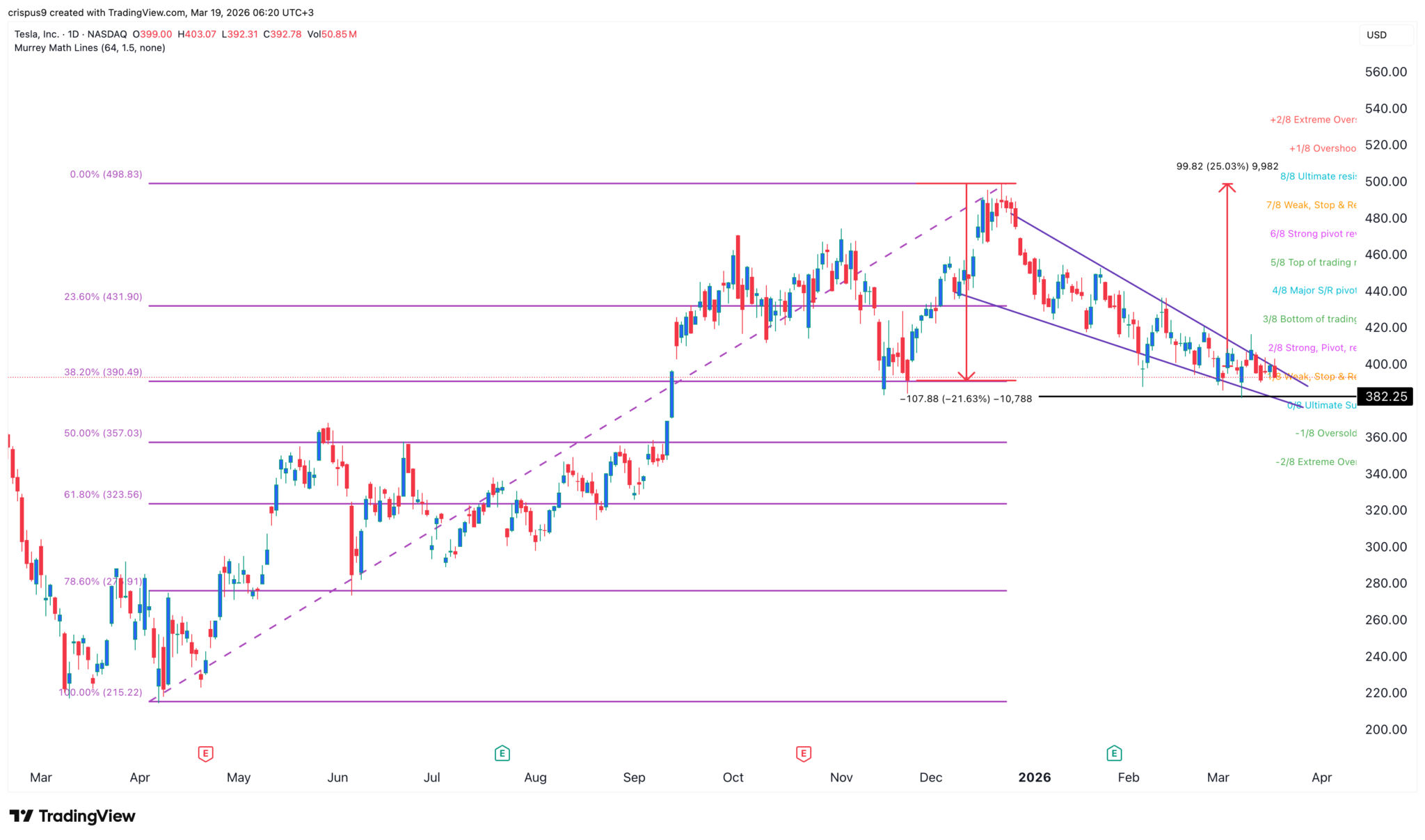 Daher ist die wahrscheinlichste Kursprognose für TSLA äußerst bullisch, solange der Kurs über dem 38,2 %-Retracement-Level bleibt. Ein solcher Anstieg könnte dazu führen, dass er weiter steigt, möglicherweise bis zum Allzeithoch von 500 $. Dieser Kurs entspricht dem „Ultimate Resistance“ des Murrey-Math-Lines-Tools.