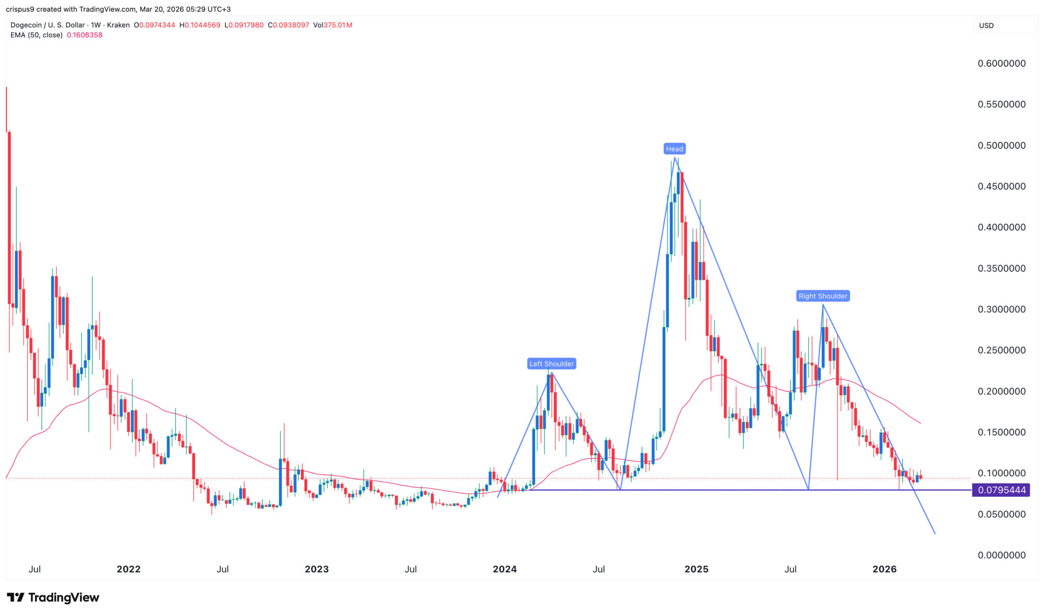 Die wahrscheinlichste DOGE-Kursprognose ist bärisch, wobei das nächste wichtige Ziel die Nackenlinie des „Head-and-Shoulders“-Chartmusters bei 0,0795 $ ist. Ein Rückgang unter diesen Kurs würde auf weitere Abwärtsbewegungen hindeuten, möglicherweise bis auf 0,05 $.