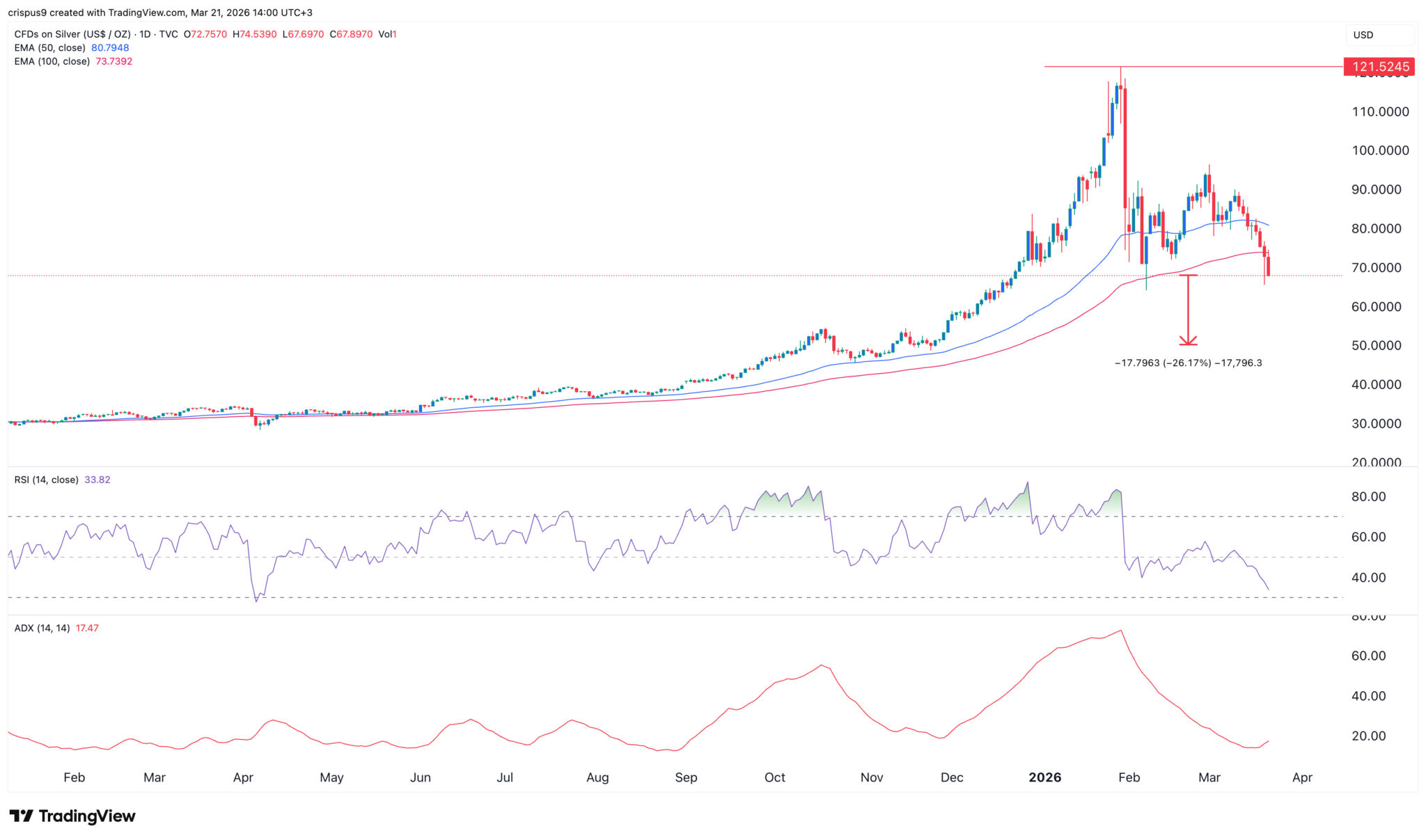 Silber-Chart | Quelle: TradingView Der Tages-Chart zeigt, dass der Silberpreis von einem Höchststand von 121 $ im Januar auf heute 67 $ gefallen ist. Er ist auf den niedrigsten Stand seit dem 6. Februar dieses Jahres gesunken.