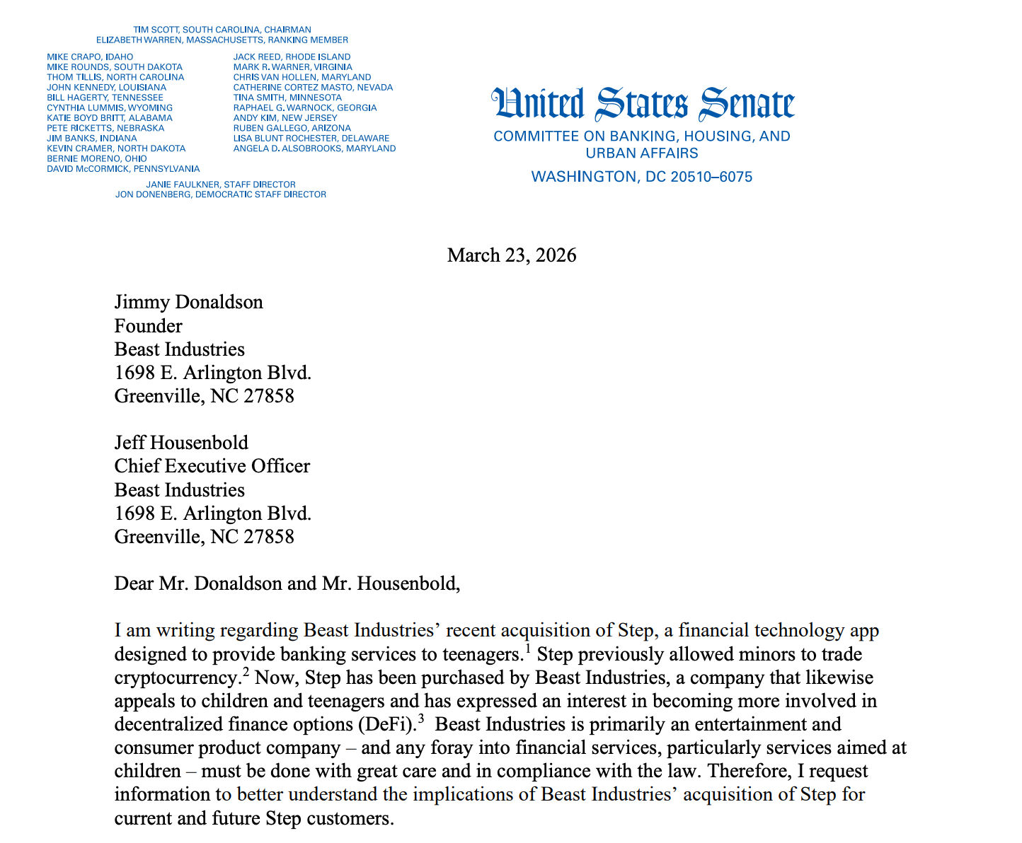 Warren richtet ihren Brief an Donaldson als Gründer und CEO und gibt Beast Industries bis zum 3. April Zeit, um eine Reihe von Fragen zu den zukünftigen Funktionen der App, ihrer regulatorischen Vergangenheit und ihren aktuellen Bankvereinbarungen zu beantworten.