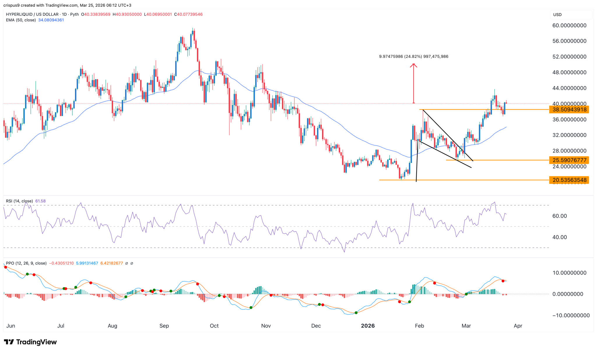Hyperliquid-Kurschart | Quelle: TradingView Der Tages-Chart zeigt, dass sich der HYPE-Kurs von einem Tiefststand von 20,5 $ im Januar auf derzeit 40 $ erholt hat. Er ist kürzlich über das wichtige Widerstandsniveau bei 38,50 $ gesprungen, seinem Höchststand im Februar. Das Überschreiten dieses Niveaus war bemerkenswert, da es den bullischen Ausblick bestätigte.