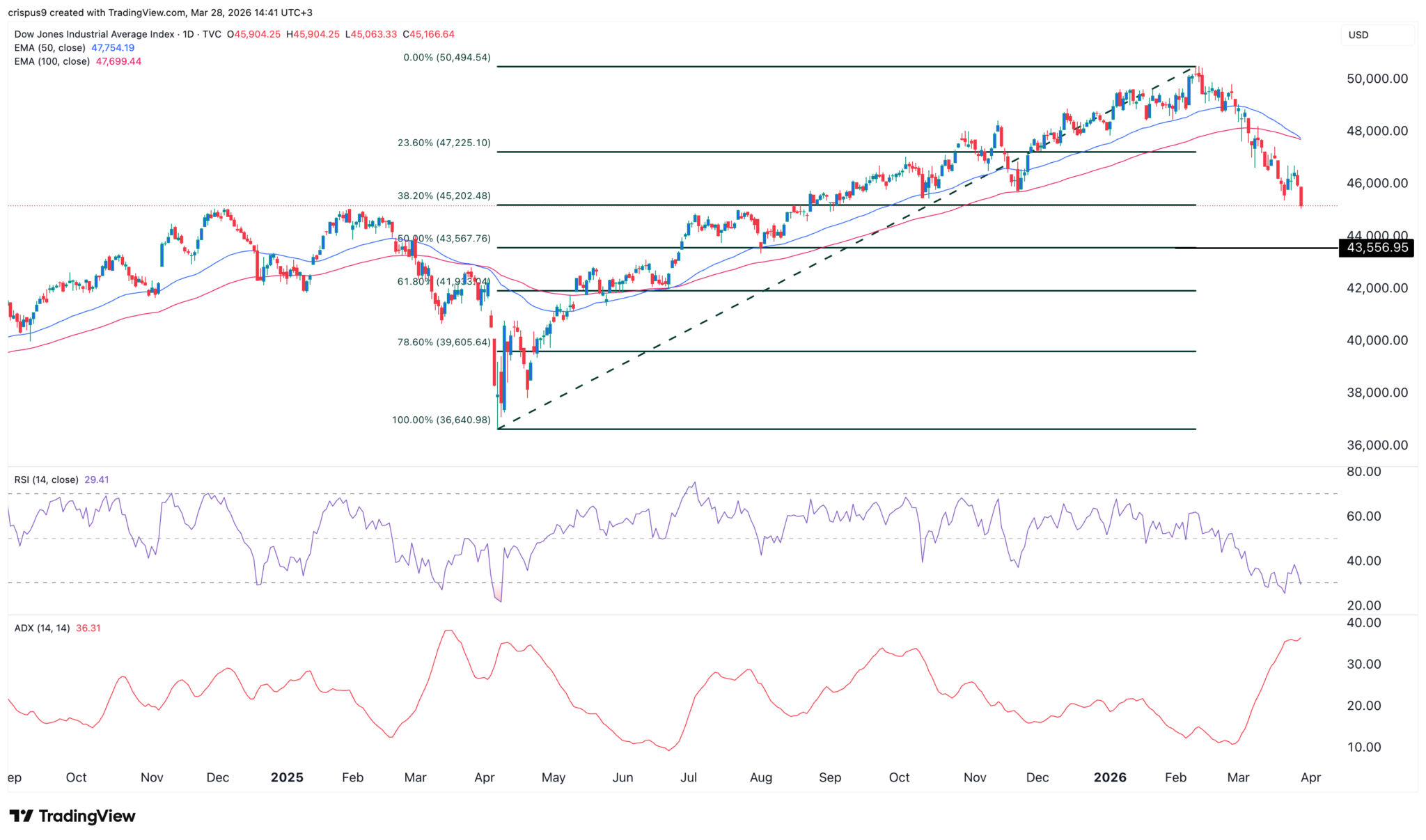Der Tageschart zeigt, dass der Dow-Jones-Index von einem Höchststand von 50.500 $ im Februar auf derzeit 45.165 $ gefallen ist. Er ist auf das 38,2 %-Fibonacci-Retracement-Niveau abgestürzt.