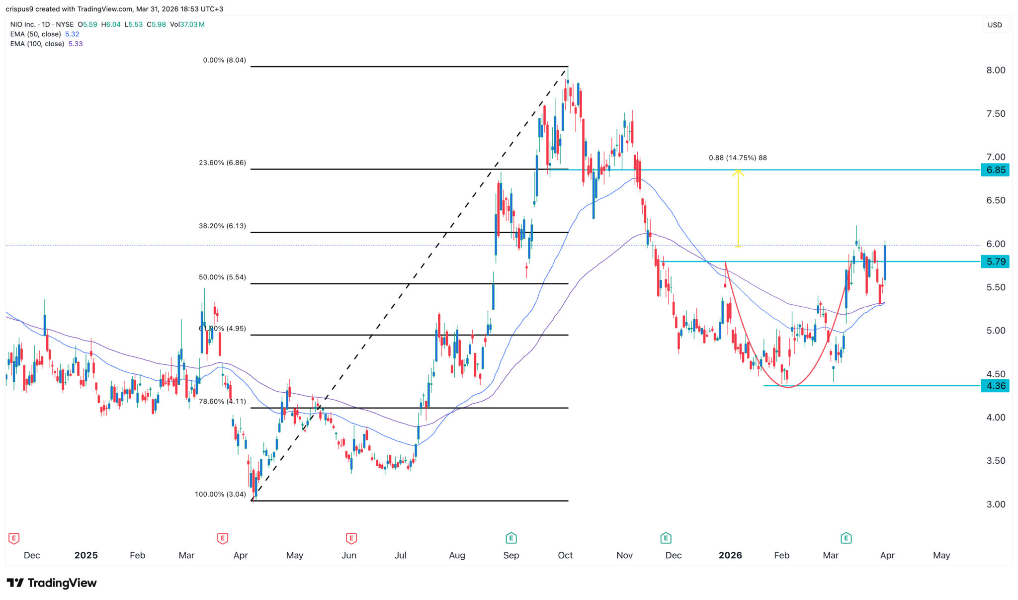 Der Kurs der Nio-Aktie stieg am Dienstag um über 6 %, da das Unternehmen seine internationale Expansion fortsetzte. Er kletterte auf 6 Dollar, den höchsten Stand seit dem 16. März, und liegt damit über 36 % über seinem diesjährigen Tiefststand. Dieser Anstieg hat die Marktkapitalisierung auf fast 15 Milliarden Dollar gebracht.