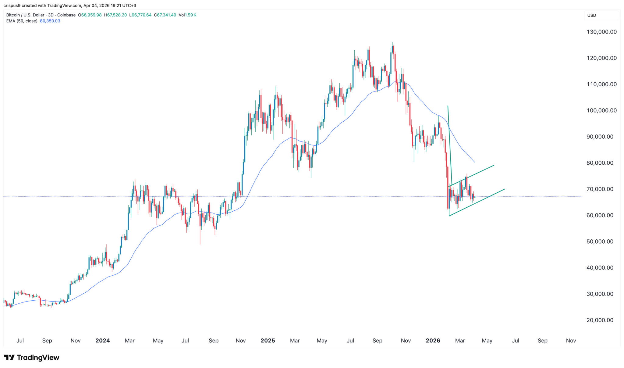 BTC-Kurschart | Quelle: TradingViewDer Dreitages-Chart zeigt, dass der BTC-Kurs in den letzten Monaten unter Druck geraten ist und von einem Höchststand von 126.300 $ im Oktober auf derzeit 67.300 $ gefallen ist.
