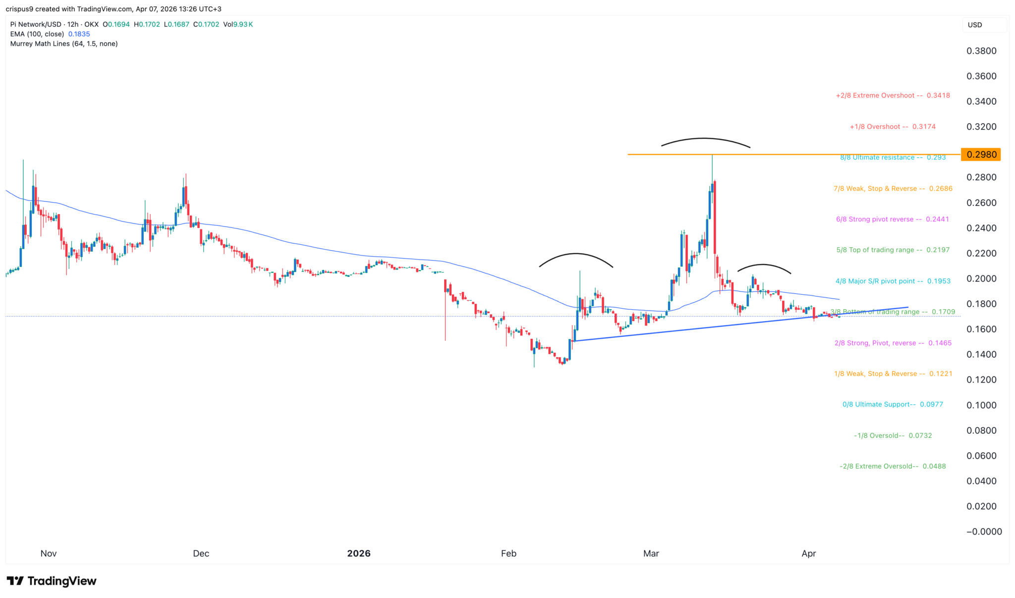 Das Pi Network hat sich in den letzten Tagen kaum bewegt, da sich die Nachfrage angesichts des anhaltenden Iran-Konflikts verschlechtert hat. Außerdem hat sich der Kurs konsolidiert, da Investoren nach dem jüngsten Pi-Day-Event und der Notierung bei Kraken auf den nächsten Impuls gewartet haben. Er liegt weiterhin um über 45 % unter seinem Höchststand vom März und hat ein riskantes Muster gebildet.