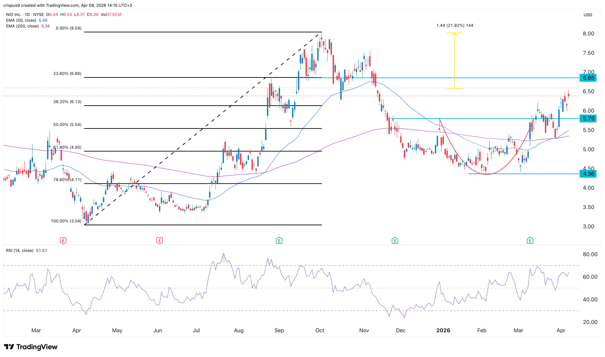 Es gibt Anzeichen dafür, dass der Nio-Aktienkurs kurzfristig noch Spielraum nach oben hat. Er ist bereits über das entscheidende Widerstandsniveau bei 5,80 $ gesprungen, die Oberkante des Cup-and-Handle-Musters. C&H ist ein beliebtes bullisches Fortsetzungsmuster.