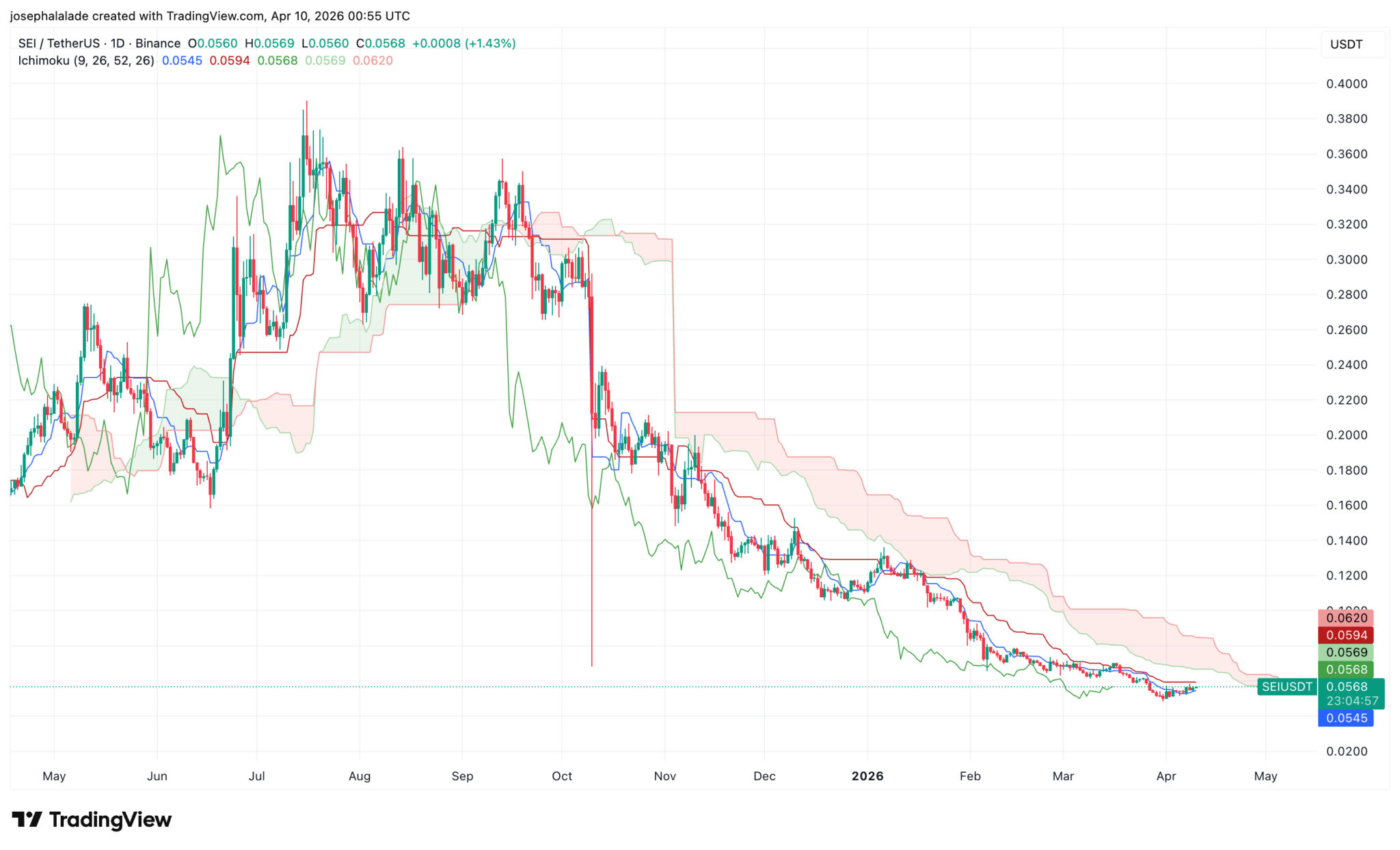 Die Ichimoku-Wolke bestätigt jede Ebene dieser Analyse. Das Chart zeigt, dass der Kurs unter die Wolke gefallen ist und diese seitdem nicht mehr getestet hat. Die Wolke selbst ist rot, fällt abwärts ab und liegt deutlich darüber, wobei die untere Grenze bei etwa 0,07–0,08 $ liegt – ein Niveau, das die SEI-Coin seit Monaten nicht mehr erreicht hat.
