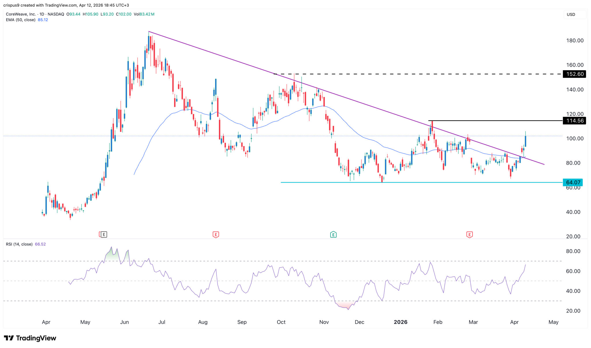 CoreWeave-Aktienchart | Quelle: TradingViewDer Tageschart zeigt, dass der CoreWeave-Aktienkurs bei 64 $ seinen Tiefpunkt erreichte, dem niedrigsten Stand im November und Dezember letzten Jahres. Das war die untere Seite des absteigenden Dreiecks, ein beliebtes Zeichen für eine bärische Fortsetzung.