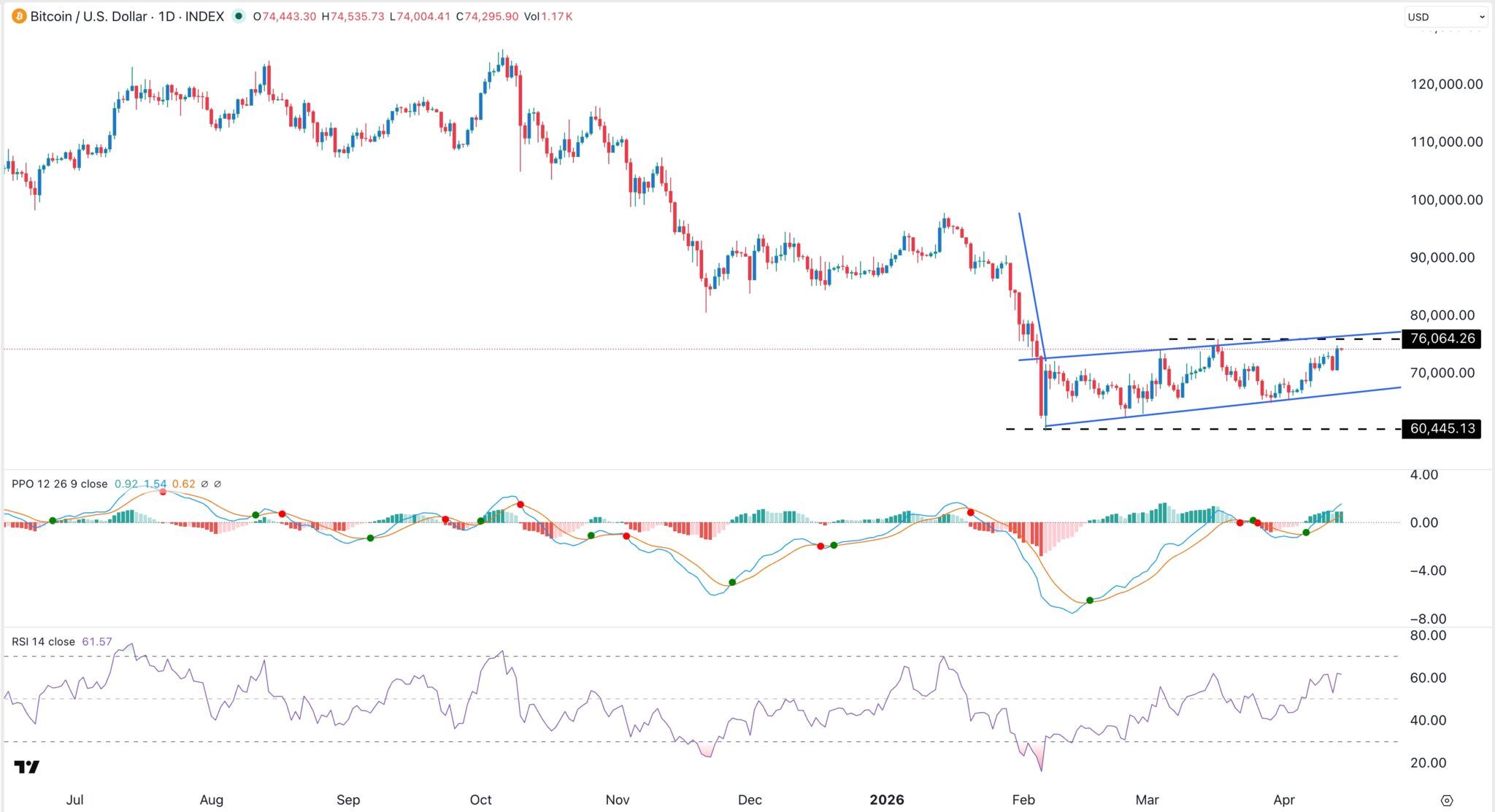 Heute gibt es eine Krypto-Rallye, obwohl die geopolitischen Risiken angesichts der anhaltenden Blockade der Straße von Hormus steigen. Der Bitcoin-Kurs sprang am Dienstag auf 74.400 US-Dollar, während die Marktkapitalisierung aller Token um über 4 % in die Höhe schoss. Zu den Top-Gewinnern gehörten RaveDAO, Venice Token, Aave, Algorand und Hyperliquid.
