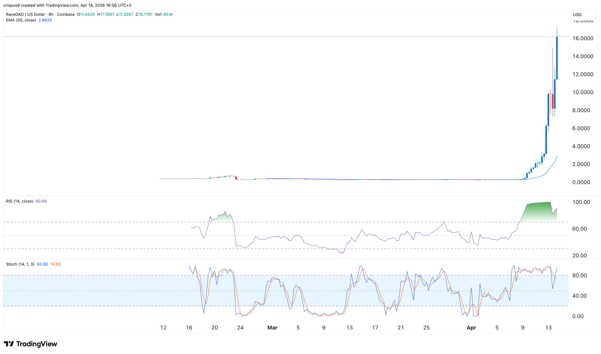 RaveDAO-Kurschart | Quelle: TradingView Der Tages-Chart zeigt, dass der RAVE-Token von einem Tiefststand von 0,14 $ in der letzten Woche auf fast 20 $ heute gestiegen ist. Der Token liegt weiterhin deutlich über allen gleitenden Durchschnitten, was das Risiko einer starken rückläufigen Trendwende mit sich bringt.