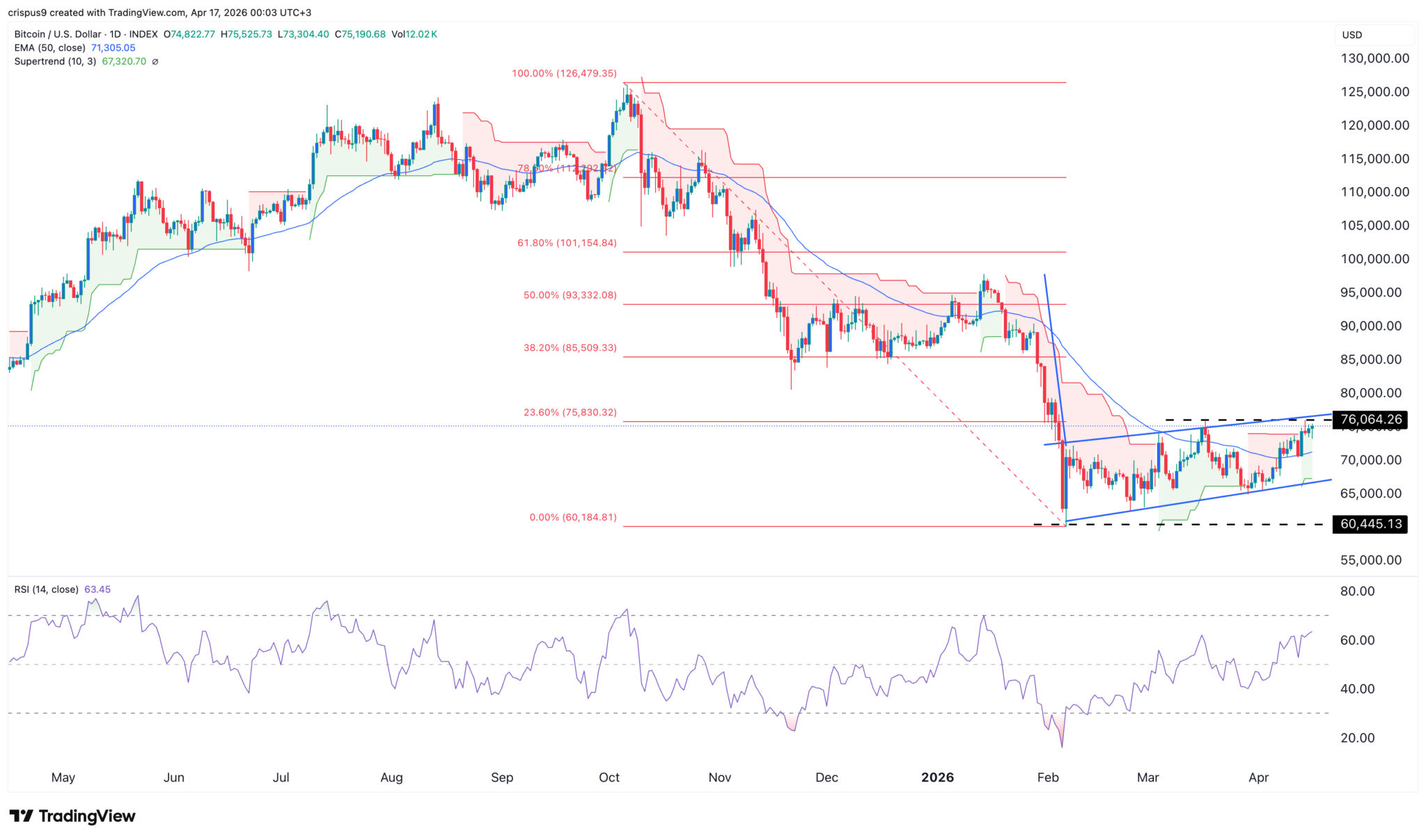 Der Tages-Chart zeigt, dass der BTC-Kurs in letzter Zeit ein starkes Comeback hingelegt hat. Allerdings tut er sich schwer, über die obere Grenze des Aufwärtskanals zu steigen, die mit dem 23,6 %-Fibonacci-Retracement-Level zusammenfällt.
