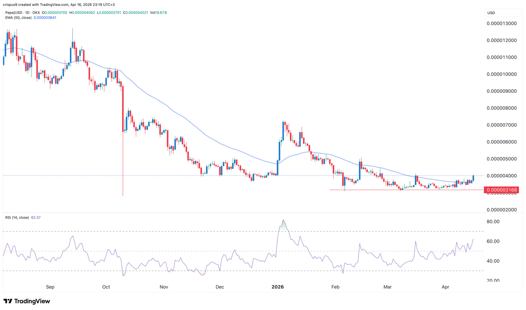 Meme-Coins sind in der Regel die größten Nutznießer von Haussephasen auf dem Kryptomarkt. In diesem Fall wird Pepe aufgrund seines niedrigen Kurses – der auf ein Tief von 0,0000040 $ gefallen ist – und seiner Beliebtheit am meisten von diesem Trend profitieren.